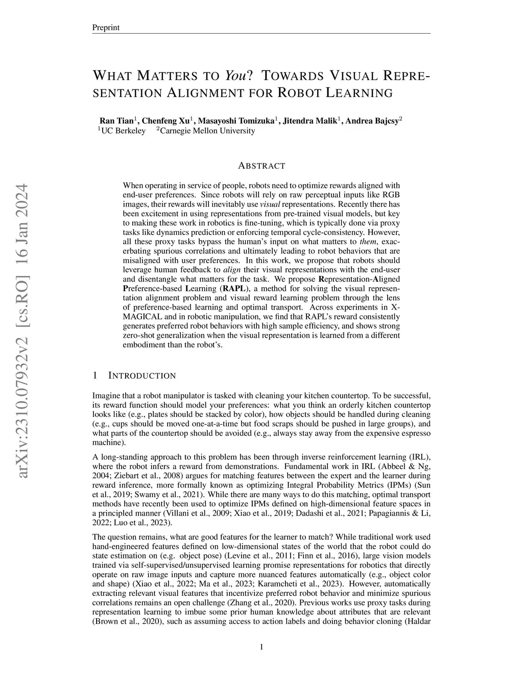 When operating in service of people, robots need to optimize rewards aligned with end-user preferences. Since robots will rely on raw perceptual inputs like RGB images, their rewards will inevitably use visual representations. Recently there has been excitement in using representations from pre-trained visual models, but key to making these work in robotics is fine-tuning, which is typically done via proxy tasks like dynamics prediction or enforcing temporal cycle-consistency. However, all these proxy tasks bypass the human's input on what matters to them, exacerbating spurious correlations and ultimately leading to robot behaviors that are misaligned with user preferences. In this work, we propose that robots should leverage human feedback to align their visual representations with the end-user and disentangle what matters for the task. We propose Representation-Aligned Preference-based Learning (RAPL), a method for solving the visual representation alignment problem and visual reward learning problem through the lens of preference-based learning and optimal transport. Across experiments in X-MAGICAL and in robotic manipulation, we find that RAPL's reward consistently generates preferred robot behaviors with high sample efficiency, and shows strong zero-shot generalization when the visual representation is learned from a different embodiment than the robot's.