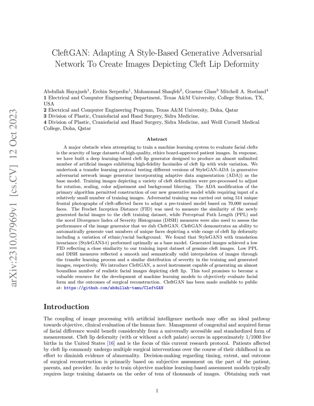 A major obstacle when attempting to train a machine learning system to evaluate facial clefts is the scarcity of large datasets of high-quality, ethics board-approved patient images. In response, we have built a deep learning-based cleft lip generator designed to produce an almost unlimited number of artificial images exhibiting high-fidelity facsimiles of cleft lip with wide variation. We undertook a transfer learning protocol testing different versions of StyleGAN-ADA (a generative adversarial network image generator incorporating adaptive data augmentation (ADA)) as the base model. Training images depicting a variety of cleft deformities were pre-processed to adjust for rotation, scaling, color adjustment and background blurring. The ADA modification of the primary algorithm permitted construction of our new generative model while requiring input of a relatively small number of training images. Adversarial training was carried out using 514 unique frontal photographs of cleft-affected faces to adapt a pre-trained model based on 70,000 normal faces. The Frechet Inception Distance (FID) was used to measure the similarity of the newly generated facial images to the cleft training dataset, while Perceptual Path Length (PPL) and the novel Divergence Index of Severity Histograms (DISH) measures were also used to assess the performance of the image generator that we dub CleftGAN. We found that StyleGAN3 with translation invariance (StyleGAN3-t) performed optimally as a base model. Generated images achieved a low FID reflecting a close similarity to our training input dataset of genuine cleft images. Low PPL and DISH measures reflected a smooth and semantically valid interpolation of images through the transfer learning process and a similar distribution of severity in the training and generated images, respectively.