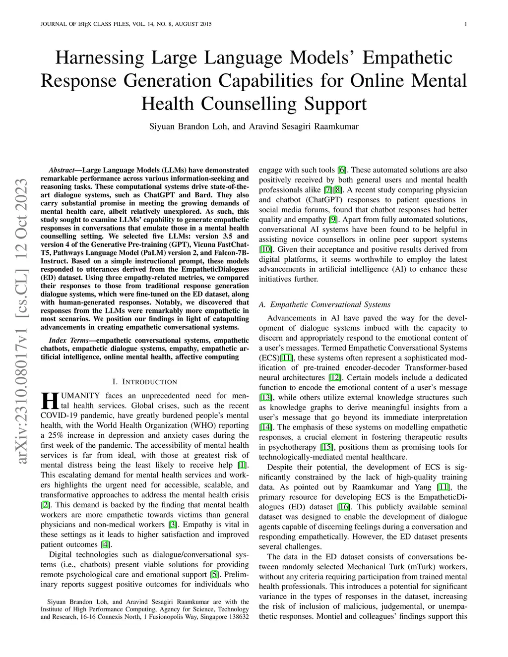Large Language Models (LLMs) have demonstrated remarkable performance across various information-seeking and reasoning tasks. These computational systems drive state-of-the-art dialogue systems, such as ChatGPT and Bard. They also carry substantial promise in meeting the growing demands of mental health care, albeit relatively unexplored. As such, this study sought to examine LLMs' capability to generate empathetic responses in conversations that emulate those in a mental health counselling setting. We selected five LLMs: version 3.5 and version 4 of the Generative Pre-training (GPT), Vicuna FastChat-T5, Pathways Language Model (PaLM) version 2, and Falcon-7B-Instruct. Based on a simple instructional prompt, these models responded to utterances derived from the EmpatheticDialogues (ED) dataset. Using three empathy-related metrics, we compared their responses to those from traditional response generation dialogue systems, which were fine-tuned on the ED dataset, along with human-generated responses. Notably, we discovered that responses from the LLMs were remarkably more empathetic in most scenarios. We position our findings in light of catapulting advancements in creating empathetic conversational systems.