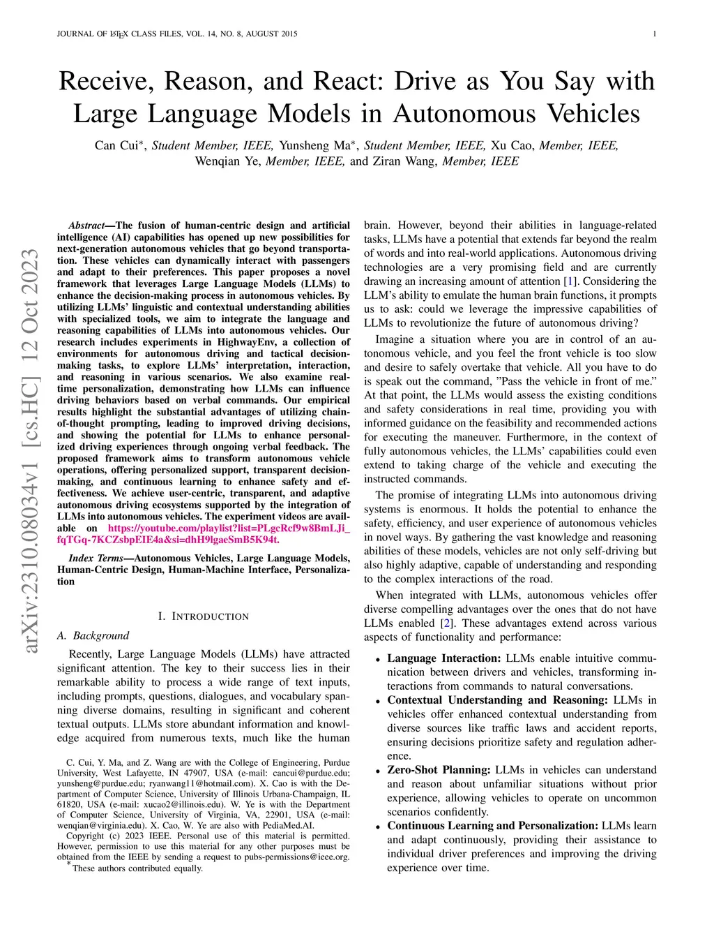 The fusion of human-centric design and artificial intelligence (AI) capabilities has opened up new possibilities for next-generation autonomous vehicles that go beyond transportation. These vehicles can dynamically interact with passengers and adapt to their preferences. This paper proposes a novel framework that leverages Large Language Models (LLMs) to enhance the decision-making process in autonomous vehicles. By utilizing LLMs' linguistic and contextual understanding abilities with specialized tools, we aim to integrate the language and reasoning capabilities of LLMs into autonomous vehicles. Our research includes experiments in HighwayEnv, a collection of environments for autonomous driving and tactical decision-making tasks, to explore LLMs' interpretation, interaction, and reasoning in various scenarios. We also examine real-time personalization, demonstrating how LLMs can influence driving behaviors based on verbal commands. Our empirical results highlight the substantial advantages of utilizing chain-of-thought prompting, leading to improved driving decisions, and showing the potential for LLMs to enhance personalized driving experiences through ongoing verbal feedback. The proposed framework aims to transform autonomous vehicle operations, offering personalized support, transparent decision-making, and continuous learning to enhance safety and effectiveness. We achieve user-centric, transparent, and adaptive autonomous driving ecosystems supported by the integration of LLMs into autonomous vehicles.