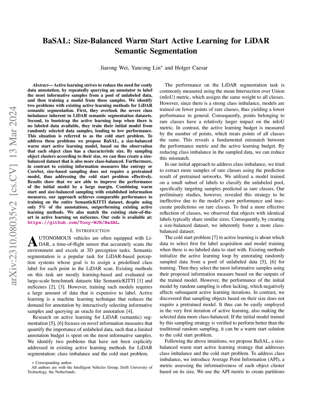 BaSAL: Size-Balanced Warm Start Active Learning for LiDAR Semantic