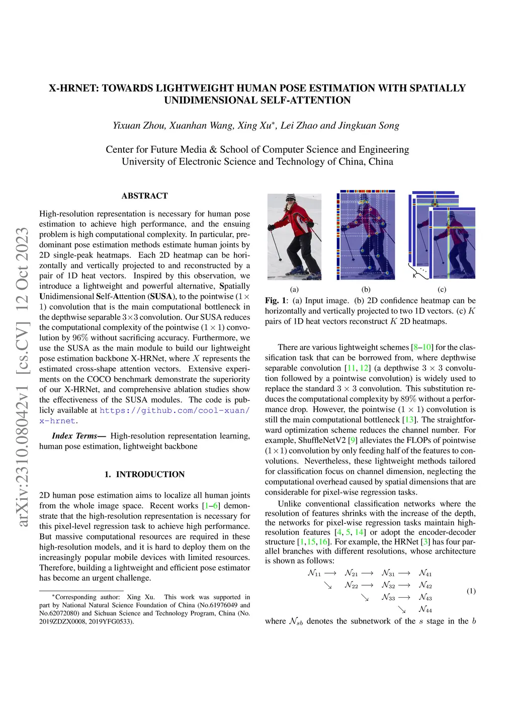 High-resolution representation is necessary for human pose estimation to achieve high performance, and the ensuing problem is high computational complexity. In particular, predominant pose estimation methods estimate human joints by 2D single-peak heatmaps. Each 2D heatmap can be horizontally and vertically projected to and reconstructed by a pair of 1D heat vectors. Inspired by this observation, we introduce a lightweight and powerful alternative, Spatially Unidimensional Self-Attention (SUSA), to the pointwise (1x1) convolution that is the main computational bottleneck in the depthwise separable 3c3 convolution. Our SUSA reduces the computational complexity of the pointwise (1x1) convolution by 96% without sacrificing accuracy. Furthermore, we use the SUSA as the main module to build our lightweight pose estimation backbone X-HRNet, where `X' represents the estimated cross-shape attention vectors. Extensive experiments on the COCO benchmark demonstrate the superiority of our X-HRNet, and comprehensive ablation studies show the effectiveness of the SUSA modules. The code is publicly available at https://github.com/cool-xuan/x-hrnet.