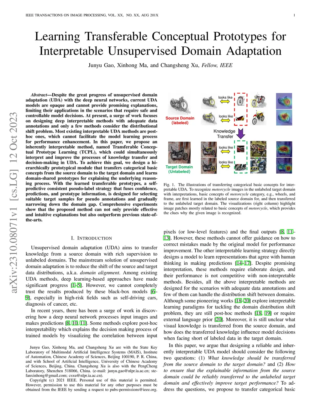 Despite the great progress of unsupervised domain adaptation (UDA) with the deep neural networks, current UDA models are opaque and cannot provide promising explanations, limiting their applications in the scenarios that require safe and controllable model decisions. At present, a surge of work focuses on designing deep interpretable methods with adequate data annotations and only a few methods consider the distributional shift problem. Most existing interpretable UDA methods are post-hoc ones, which cannot facilitate the model learning process for performance enhancement. In this paper, we propose an inherently interpretable method, named Transferable Conceptual Prototype Learning (TCPL), which could simultaneously interpret and improve the processes of knowledge transfer and decision-making in UDA. To achieve this goal, we design a hierarchically prototypical module that transfers categorical basic concepts from the source domain to the target domain and learns domain-shared prototypes for explaining the underlying reasoning process. With the learned transferable prototypes, a self-predictive consistent pseudo-label strategy that fuses confidence, predictions, and prototype information, is designed for selecting suitable target samples for pseudo annotations and gradually narrowing down the domain gap. Comprehensive experiments show that the proposed method can not only provide effective and intuitive explanations but also outperform previous state-of-the-arts.