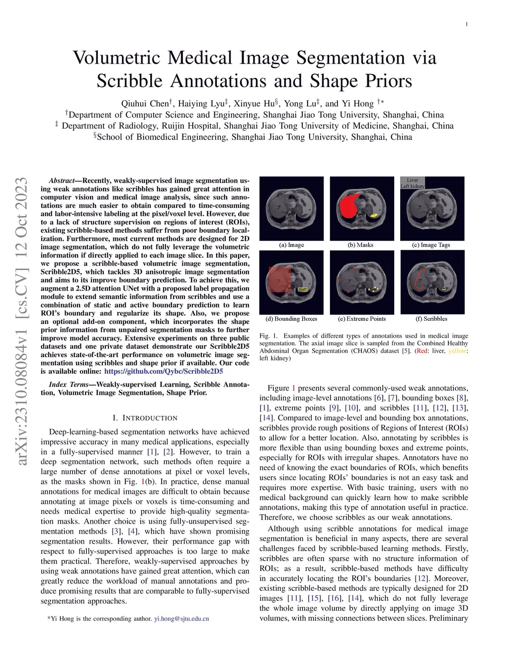 Volumetric Medical Image Segmentation via Scribble Annotations and Shape