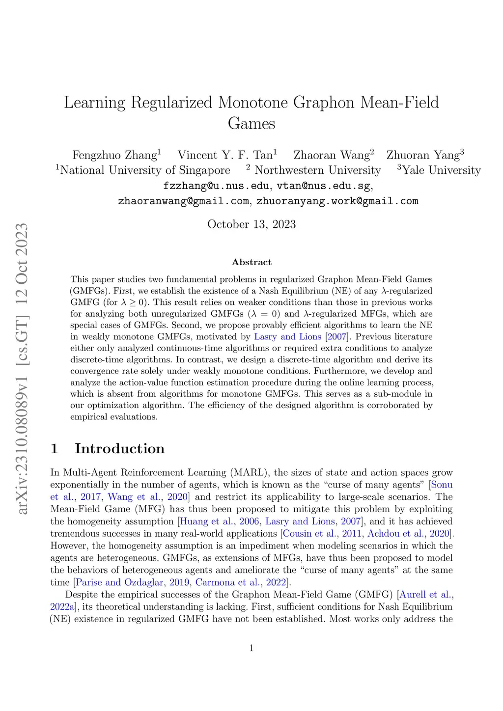 This paper studies two fundamental problems in regularized Graphon Mean-Field Games (GMFGs). First, we establish the existence of a Nash Equilibrium (NE) of any -regularized GMFG (for ). This result relies on weaker conditions than those in previous works for analyzing both unregularized GMFGs () and -regularized MFGs, which are special cases of GMFGs. Second, we propose provably efficient algorithms to learn the NE in weakly monotone GMFGs, motivated by Lasry and Lions [2007]. Previous literature either only analyzed continuous-time algorithms or required extra conditions to analyze discrete-time algorithms. In contrast, we design a discrete-time algorithm and derive its convergence rate solely under weakly monotone conditions. Furthermore, we develop and analyze the action-value function estimation procedure during the online learning process, which is absent from algorithms for monotone GMFGs. This serves as a sub-module in our optimization algorithm. The efficiency of the designed algorithm is corroborated by empirical evaluations.