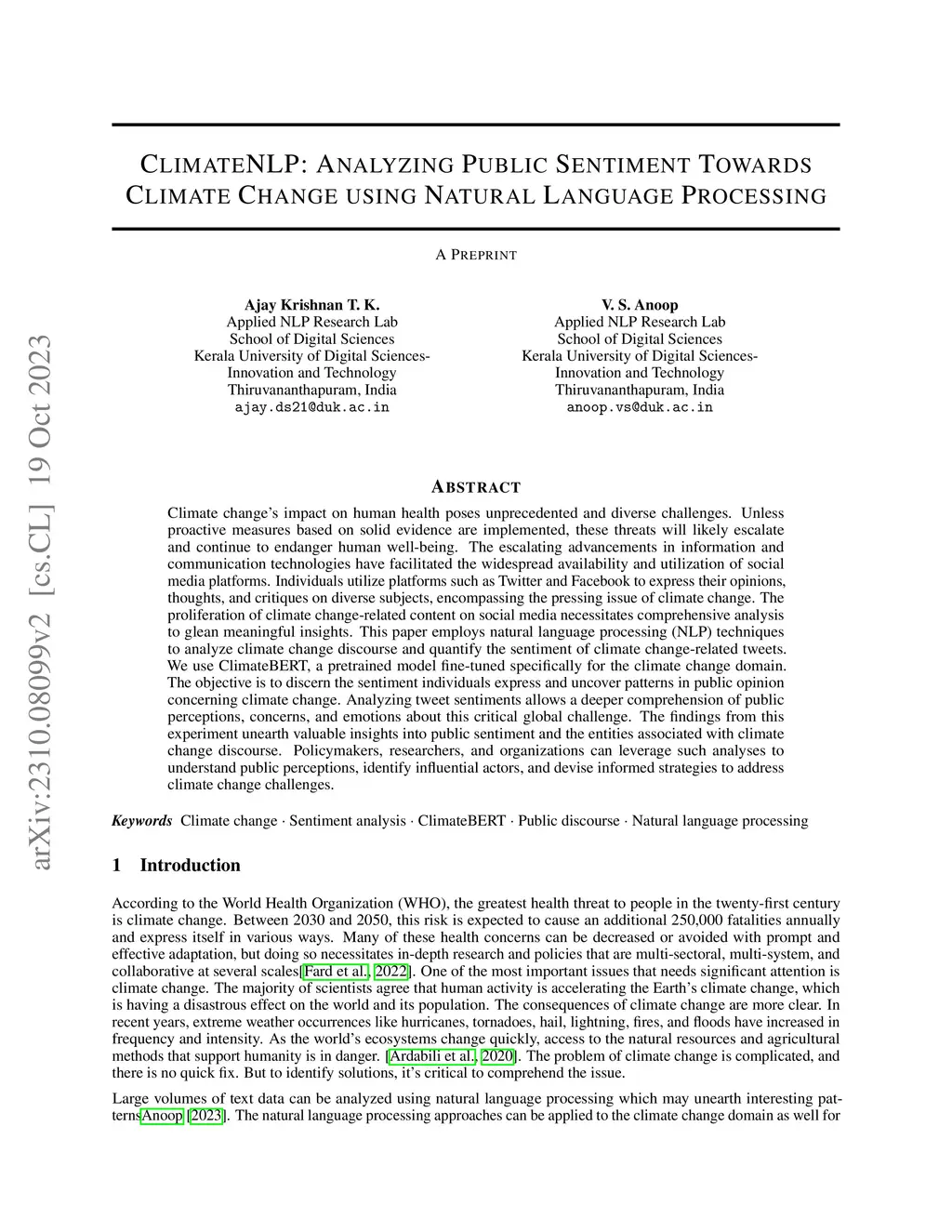 Climate change's impact on human health poses unprecedented and diverse challenges. Unless proactive measures based on solid evidence are implemented, these threats will likely escalate and continue to endanger human well-being. The escalating advancements in information and communication technologies have facilitated the widespread availability and utilization of social media platforms. Individuals utilize platforms such as Twitter and Facebook to express their opinions, thoughts, and critiques on diverse subjects, encompassing the pressing issue of climate change. The proliferation of climate change-related content on social media necessitates comprehensive analysis to glean meaningful insights. This paper employs natural language processing (NLP) techniques to analyze climate change discourse and quantify the sentiment of climate change-related tweets. We use ClimateBERT, a pretrained model fine-tuned specifically for the climate change domain. The objective is to discern the sentiment individuals express and uncover patterns in public opinion concerning climate change. Analyzing tweet sentiments allows a deeper comprehension of public perceptions, concerns, and emotions about this critical global challenge. The findings from this experiment unearth valuable insights into public sentiment and the entities associated with climate change discourse. Policymakers, researchers, and organizations can leverage such analyses to understand public perceptions, identify influential actors, and devise informed strategies to address climate change challenges.