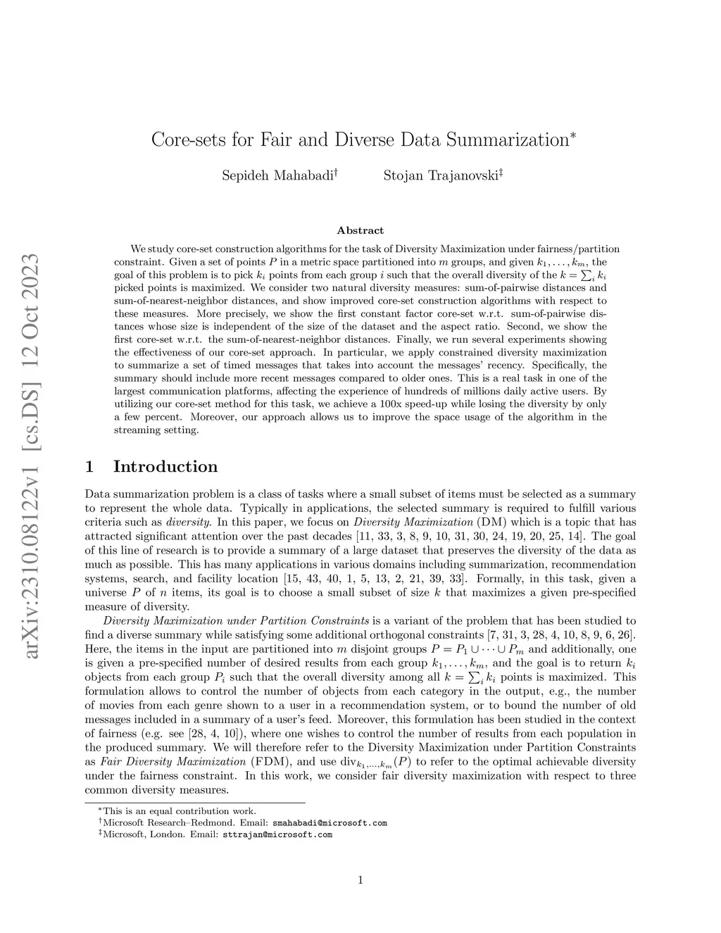 We study core-set construction algorithms for the task of Diversity Maximization under fairness/partition constraint. Given a set of points in a metric space partitioned into groups, and given , the goal of this problem is to pick points from each group such that the overall diversity of the picked points is maximized. We consider two natural diversity measures: sum-of-pairwise distances and sum-of-nearest-neighbor distances, and show improved core-set construction algorithms with respect to these measures. More precisely, we show the first constant factor core-set w.r.t. sum-of-pairwise distances whose size is independent of the size of the dataset and the aspect ratio. Second, we show the first core-set w.r.t. the sum-of-nearest-neighbor distances. Finally, we run several experiments showing the effectiveness of our core-set approach. In particular, we apply constrained diversity maximization to summarize a set of timed messages that takes into account the messages' recency. Specifically, the summary should include more recent messages compared to older ones. This is a real task in one of the largest communication platforms, affecting the experience of hundreds of millions daily active users. By utilizing our core-set method for this task, we achieve a 100x speed-up while losing the diversity by only a few percent. Moreover, our approach allows us to improve the space usage of the algorithm in the streaming setting.
