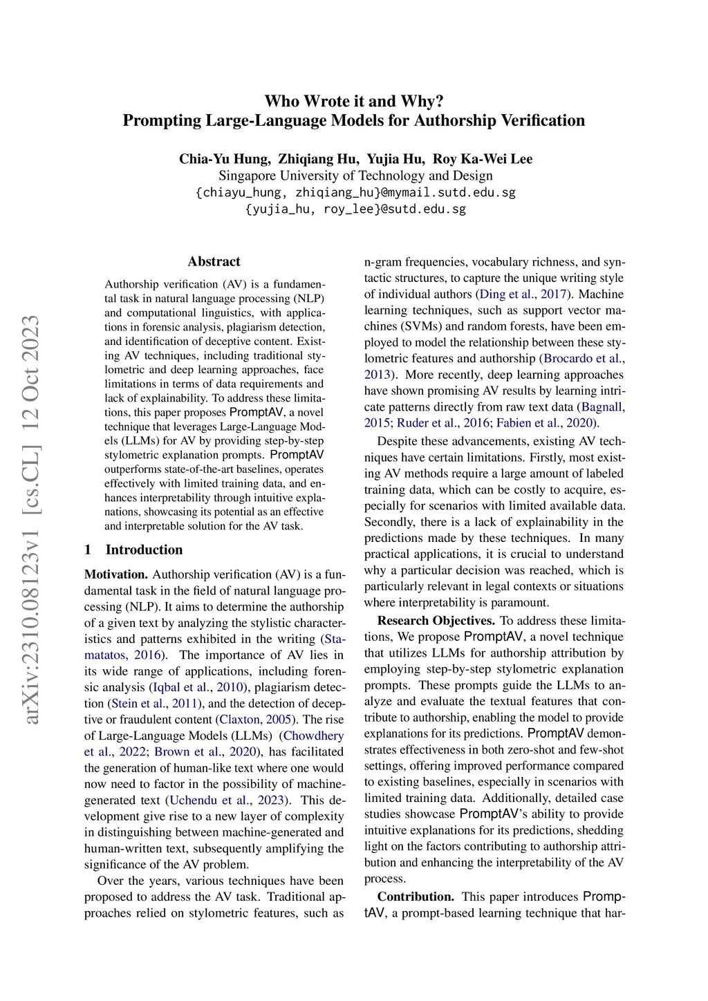 Authorship verification (AV) is a fundamental task in natural language processing (NLP) and computational linguistics, with applications in forensic analysis, plagiarism detection, and identification of deceptive content. Existing AV techniques, including traditional stylometric and deep learning approaches, face limitations in terms of data requirements and lack of explainability. To address these limitations, this paper proposes PromptAV, a novel technique that leverages Large-Language Models (LLMs) for AV by providing step-by-step stylometric explanation prompts. PromptAV outperforms state-of-the-art baselines, operates effectively with limited training data, and enhances interpretability through intuitive explanations, showcasing its potential as an effective and interpretable solution for the AV task.
