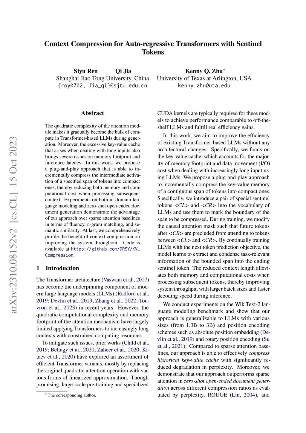 The quadratic complexity of the attention module makes it gradually become the bulk of compute in Transformer-based LLMs during generation. Moreover, the excessive key-value cache that arises when dealing with long inputs also brings severe issues on memory footprint and inference latency. In this work, we propose a plug-and-play approach that is able to incrementally compress the intermediate activation of a specified span of tokens into compact ones, thereby reducing both memory and computational cost when processing subsequent context. Experiments on both in-domain language modeling and zero-shot open-ended document generation demonstrate the advantage of our approach over sparse attention baselines in terms of fluency, n-gram matching, and semantic similarity. At last, we comprehensively profile the benefit of context compression on improving the system throughout. Code is available at https://github.com/DRSY/KV_Compression.