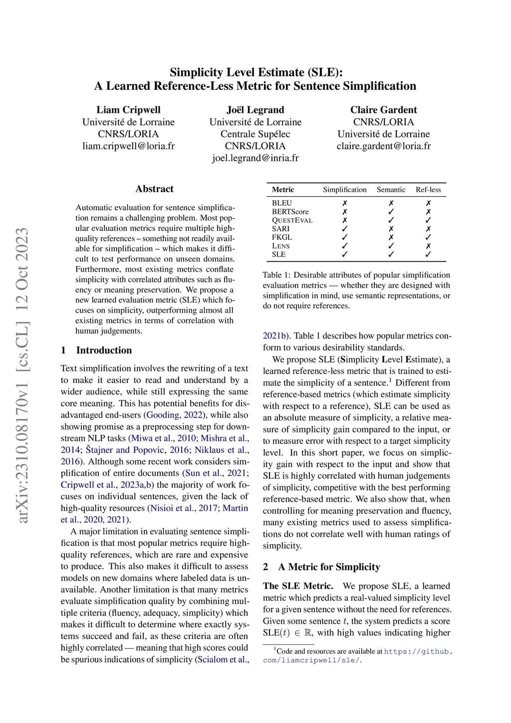 Simplicity Level Estimate (SLE): A Learned Reference-Less Metric for