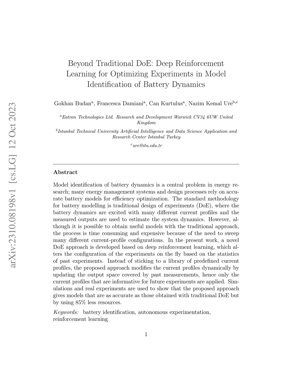 Model identification of battery dynamics is a central problem in energy research; many energy management systems and design processes rely on accurate battery models for efficiency optimization. The standard methodology for battery modelling is traditional design of experiments (DoE), where the battery dynamics are excited with many different current profiles and the measured outputs are used to estimate the system dynamics. However, although it is possible to obtain useful models with the traditional approach, the process is time consuming and expensive because of the need to sweep many different current-profile configurations. In the present work, a novel DoE approach is developed based on deep reinforcement learning, which alters the configuration of the experiments on the fly based on the statistics of past experiments. Instead of sticking to a library of predefined current profiles, the proposed approach modifies the current profiles dynamically by updating the output space covered by past measurements, hence only the current profiles that are informative for future experiments are applied. Simulations and real experiments are used to show that the proposed approach gives models that are as accurate as those obtained with traditional DoE but by using 85\% less resources.