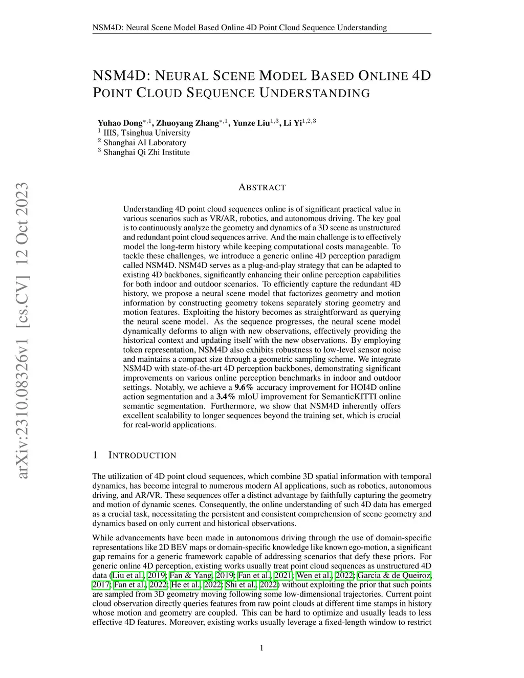 Understanding 4D point cloud sequences online is of significant practical value in various scenarios such as VR/AR, robotics, and autonomous driving. The key goal is to continuously analyze the geometry and dynamics of a 3D scene as unstructured and redundant point cloud sequences arrive. And the main challenge is to effectively model the long-term history while keeping computational costs manageable. To tackle these challenges, we introduce a generic online 4D perception paradigm called NSM4D. NSM4D serves as a plug-and-play strategy that can be adapted to existing 4D backbones, significantly enhancing their online perception capabilities for both indoor and outdoor scenarios. To efficiently capture the redundant 4D history, we propose a neural scene model that factorizes geometry and motion information by constructing geometry tokens separately storing geometry and motion features. Exploiting the history becomes as straightforward as querying the neural scene model. As the sequence progresses, the neural scene model dynamically deforms to align with new observations, effectively providing the historical context and updating itself with the new observations. By employing token representation, NSM4D also exhibits robustness to low-level sensor noise and maintains a compact size through a geometric sampling scheme. We integrate NSM4D with state-of-the-art 4D perception backbones, demonstrating significant improvements on various online perception benchmarks in indoor and outdoor settings. Notably, we achieve a 9.6% accuracy improvement for HOI4D online action segmentation and a 3.4% mIoU improvement for SemanticKITTI online semantic segmentation. Furthermore, we show that NSM4D inherently offers excellent scalability to longer sequences beyond the training set, which is crucial for real-world applications.