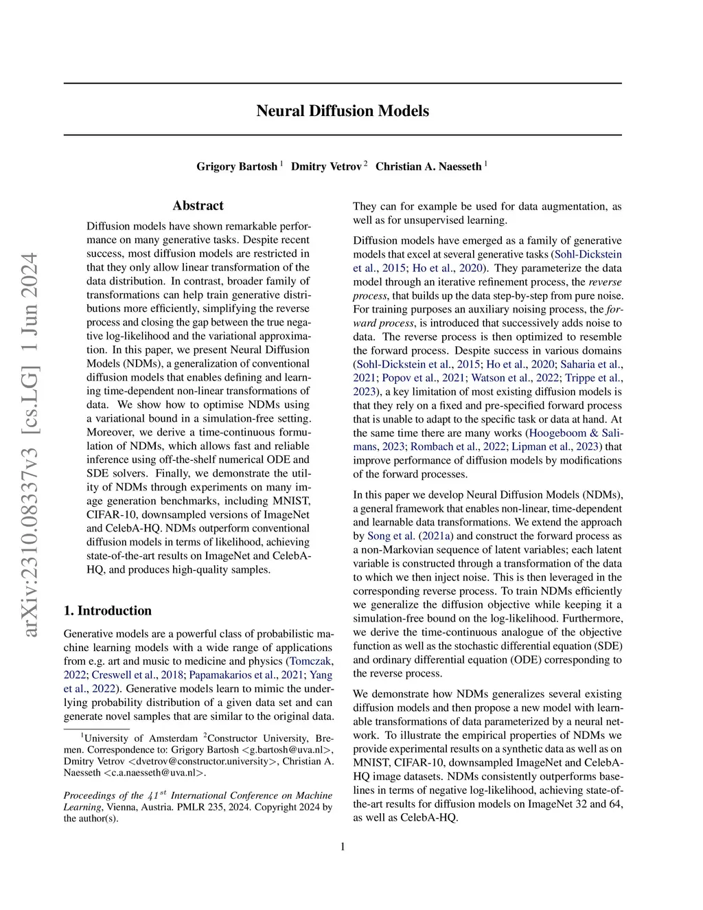 Diffusion models have shown remarkable performance on many generative tasks. Despite recent success, most diffusion models are restricted in that they only allow linear transformation of the data distribution. In contrast, broader family of transformations can potentially help train generative distributions more efficiently, simplifying the reverse process and closing the gap between the true negative log-likelihood and the variational approximation. In this paper, we present Neural Diffusion Models (NDMs), a generalization of conventional diffusion models that enables defining and learning time-dependent non-linear transformations of data. We show how to optimise NDMs using a variational bound in a simulation-free setting. Moreover, we derive a time-continuous formulation of NDMs, which allows fast and reliable inference using off-the-shelf numerical ODE and SDE solvers. Finally, we demonstrate the utility of NDMs with learnable transformations through experiments on standard image generation benchmarks, including CIFAR-10, downsampled versions of ImageNet and CelebA-HQ. NDMs outperform conventional diffusion models in terms of likelihood and produce high-quality samples.