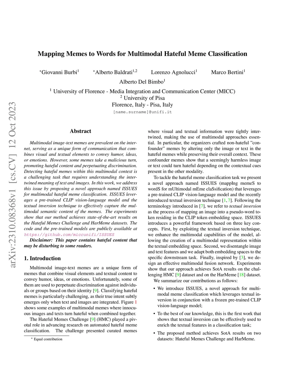 Multimodal image-text memes are prevalent on the internet, serving as a unique form of communication that combines visual and textual elements to convey humor, ideas, or emotions. However, some memes take a malicious turn, promoting hateful content and perpetuating discrimination. Detecting hateful memes within this multimodal context is a challenging task that requires understanding the intertwined meaning of text and images. In this work, we address this issue by proposing a novel approach named ISSUES for multimodal hateful meme classification. ISSUES leverages a pre-trained CLIP vision-language model and the textual inversion technique to effectively capture the multimodal semantic content of the memes. The experiments show that our method achieves state-of-the-art results on the Hateful Memes Challenge and HarMeme datasets. The code and the pre-trained models are publicly available at https://github.com/miccunifi/ISSUES.