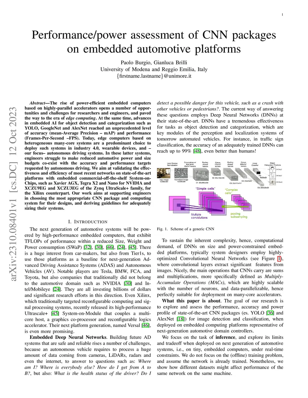 The rise of power-efficient embedded computers based on highly-parallel accelerators opens a number of opportunities and challenges for researchers and engineers, and paved the way to the era of edge computing. At the same time, advances in embedded AI for object detection and categorization such as YOLO, GoogleNet and AlexNet reached an unprecedented level of accuracy (mean-Average Precision - mAP) and performance (Frames-Per-Second - FPS). Today, edge computers based on heterogeneous many-core systems are a predominant choice to deploy such systems in industry 4.0, wearable devices, and - our focus - autonomous driving systems. In these latter systems, engineers struggle to make reduced automotive power and size budgets co-exist with the accuracy and performance targets requested by autonomous driving. We aim at validating the effectiveness and efficiency of most recent networks on state-of-the-art platforms with embedded commercial-off-the-shelf System-on-Chips, such as Xavier AGX, Tegra X2 and Nano for NVIDIA and XCZU9EG and XCZU3EG of the Zynq UltraScale+ family, for the Xilinx counterpart. Our work aims at supporting engineers in choosing the most appropriate CNN package and computing system for their designs, and deriving guidelines for adequately sizing their systems.