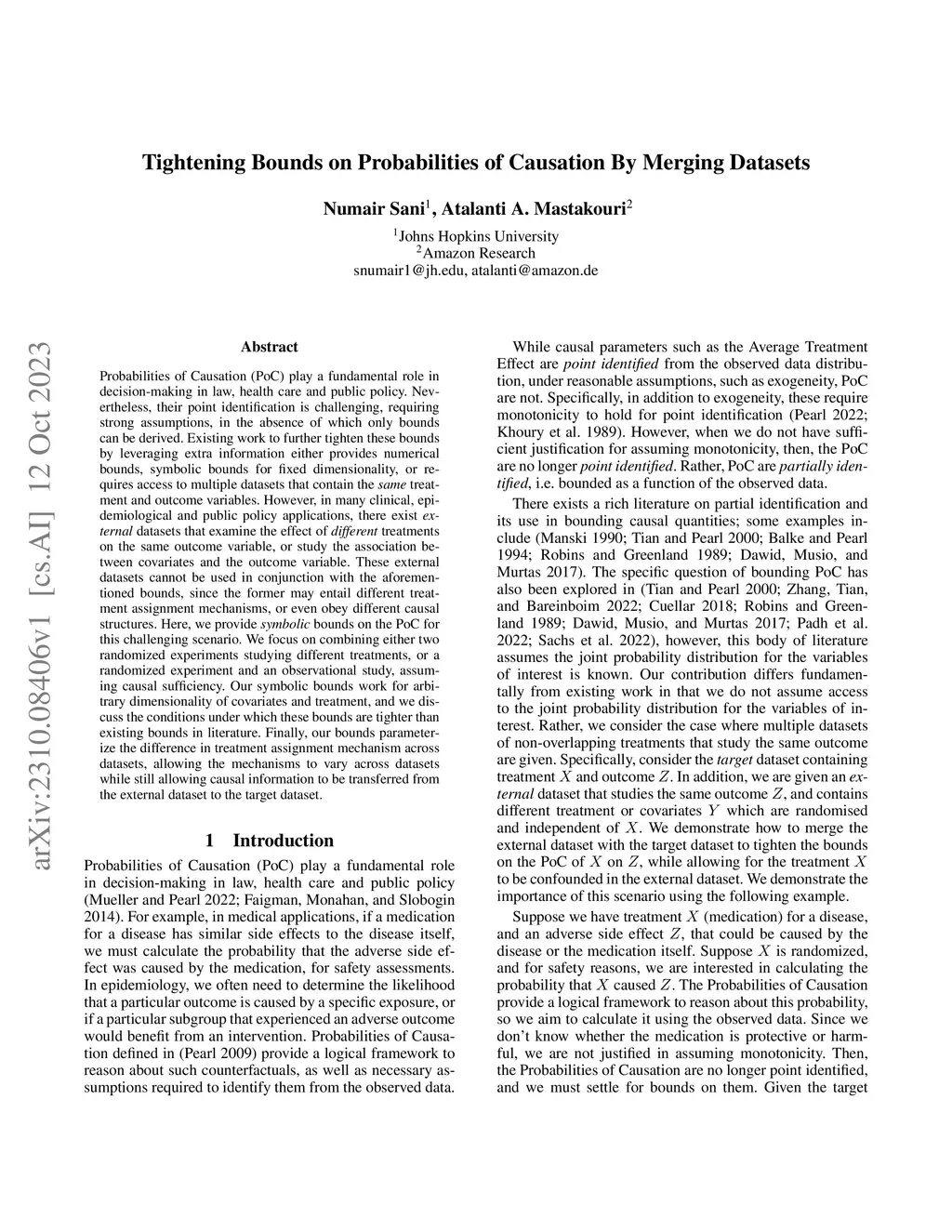Tightening Bounds on Probabilities of Causation By Merging Datasets