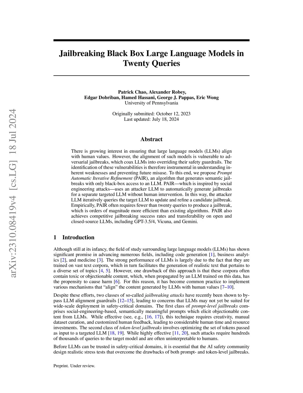 There is growing interest in ensuring that large language models (LLMs) align with human values. However, the alignment of such models is vulnerable to adversarial jailbreaks, which coax LLMs into overriding their safety guardrails. The identification of these vulnerabilities is therefore instrumental in understanding inherent weaknesses and preventing future misuse. To this end, we propose Prompt Automatic Iterative Refinement (PAIR), an algorithm that generates semantic jailbreaks with only black-box access to an LLM. PAIR -- which is inspired by social engineering attacks -- uses an attacker LLM to automatically generate jailbreaks for a separate targeted LLM without human intervention. In this way, the attacker LLM iteratively queries the target LLM to update and refine a candidate jailbreak. Empirically, PAIR often requires fewer than twenty queries to produce a jailbreak, which is orders of magnitude more efficient than existing algorithms. PAIR also achieves competitive jailbreaking success rates and transferability on open and closed-source LLMs, including GPT-3.5/4, Vicuna, and Gemini.