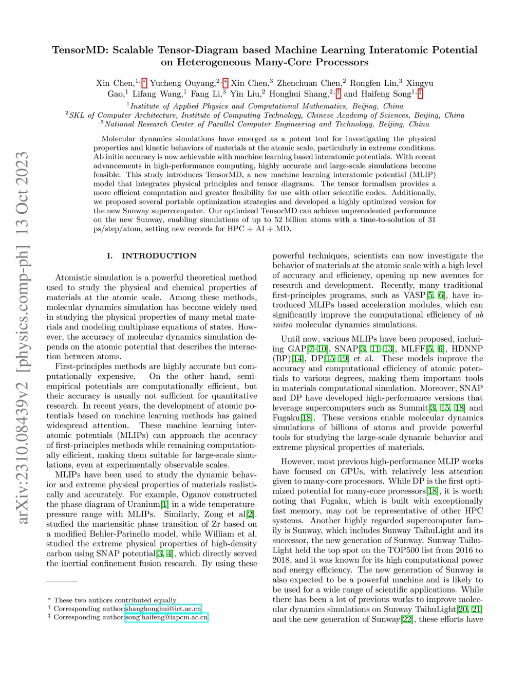 Molecular dynamics simulations have emerged as a potent tool for investigating the physical properties and kinetic behaviors of materials at the atomic scale, particularly in extreme conditions. Ab initio accuracy is now achievable with machine learning based interatomic potentials. With recent advancements in high-performance computing, highly accurate and large-scale simulations become feasible. This study introduces TensorMD, a new machine learning interatomic potential (MLIP) model that integrates physical principles and tensor diagrams. The tensor formalism provides a more efficient computation and greater flexibility for use with other scientific codes. Additionally, we proposed several portable optimization strategies and developed a highly optimized version for the new Sunway supercomputer. Our optimized TensorMD can achieve unprecedented performance on the new Sunway, enabling simulations of up to 52 billion atoms with a time-to-solution of 31 ps/step/atom, setting new records for HPC + AI + MD.