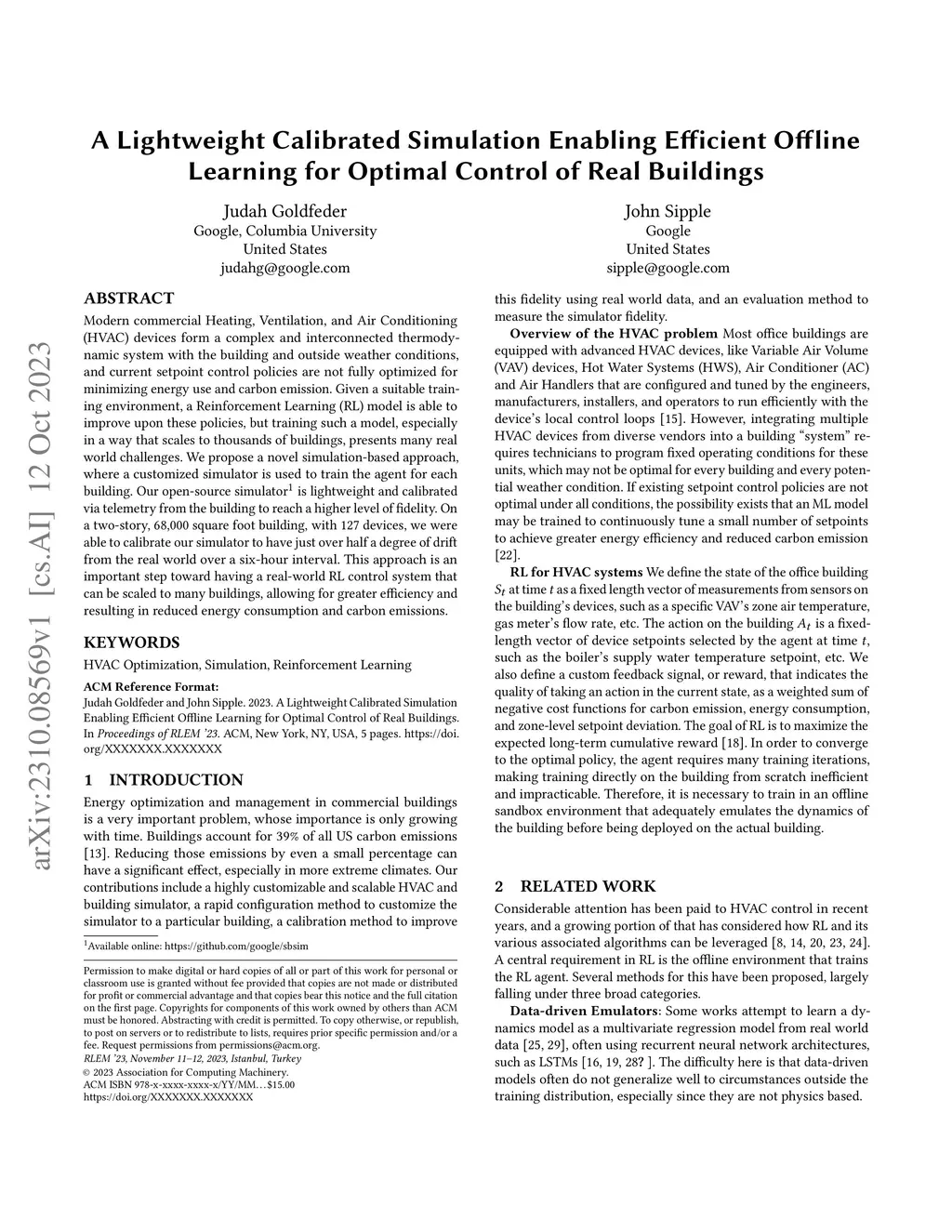 Modern commercial Heating, Ventilation, and Air Conditioning (HVAC) devices form a complex and interconnected thermodynamic system with the building and outside weather conditions, and current setpoint control policies are not fully optimized for minimizing energy use and carbon emission. Given a suitable training environment, a Reinforcement Learning (RL) model is able to improve upon these policies, but training such a model, especially in a way that scales to thousands of buildings, presents many real world challenges. We propose a novel simulation-based approach, where a customized simulator is used to train the agent for each building. Our open-source simulator (available online: https://github.com/google/sbsim) is lightweight and calibrated via telemetry from the building to reach a higher level of fidelity. On a two-story, 68,000 square foot building, with 127 devices, we were able to calibrate our simulator to have just over half a degree of drift from the real world over a six-hour interval. This approach is an important step toward having a real-world RL control system that can be scaled to many buildings, allowing for greater efficiency and resulting in reduced energy consumption and carbon emissions.