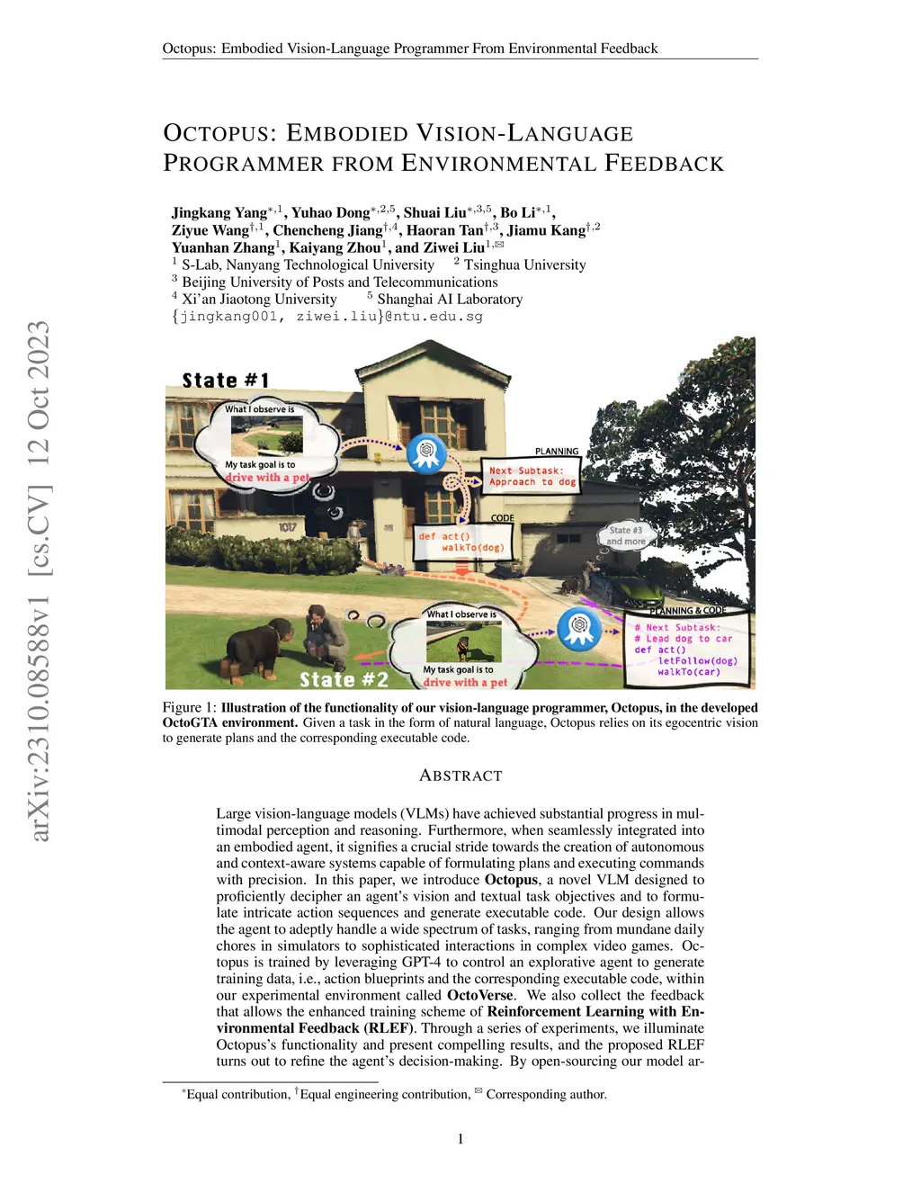 Large vision-language models (VLMs) have achieved substantial progress in multimodal perception and reasoning. Furthermore, when seamlessly integrated into an embodied agent, it signifies a crucial stride towards the creation of autonomous and context-aware systems capable of formulating plans and executing commands with precision. In this paper, we introduce Octopus, a novel VLM designed to proficiently decipher an agent's vision and textual task objectives and to formulate intricate action sequences and generate executable code. Our design allows the agent to adeptly handle a wide spectrum of tasks, ranging from mundane daily chores in simulators to sophisticated interactions in complex video games. Octopus is trained by leveraging GPT-4 to control an explorative agent to generate training data, i.e., action blueprints and the corresponding executable code, within our experimental environment called OctoVerse. We also collect the feedback that allows the enhanced training scheme of Reinforcement Learning with Environmental Feedback (RLEF). Through a series of experiments, we illuminate Octopus's functionality and present compelling results, and the proposed RLEF turns out to refine the agent's decision-making. By open-sourcing our model architecture, simulator, and dataset, we aspire to ignite further innovation and foster collaborative applications within the broader embodied AI community.