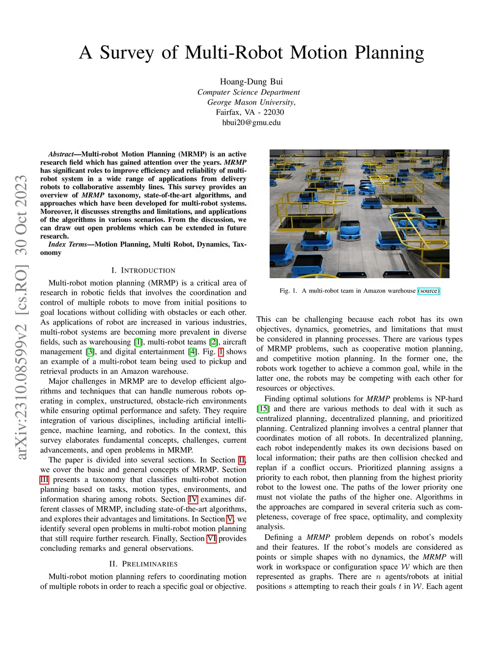Multi-robot Motion Planning (MRMP) is an active research field which has gained attention over the years. MRMP has significant roles to improve the efficiency and reliability of multi-robot system in a wide range of applications from delivery robots to collaborative assembly lines. This survey provides an overview of MRMP taxonomy, state-of-the-art algorithms, and approaches which have been developed for multi-robot systems. This study also discusses the strengths and limitations of each algorithm and their applications in various scenarios. Moreover, based on this, we can draw out open problems for future research.