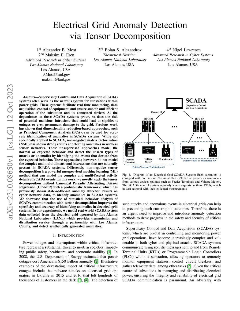 Supervisory Control and Data Acquisition (SCADA) systems often serve as the nervous system for substations within power grids. These systems facilitate real-time monitoring, data acquisition, control of equipment, and ensure smooth and efficient operation of the substation and its connected devices. Previous work has shown that dimensionality reduction-based approaches, such as Principal Component Analysis (PCA), can be used for accurate identification of anomalies in SCADA systems. While not specifically applied to SCADA, non-negative matrix factorization (NMF) has shown strong results at detecting anomalies in wireless sensor networks. These unsupervised approaches model the normal or expected behavior and detect the unseen types of attacks or anomalies by identifying the events that deviate from the expected behavior. These approaches; however, do not model the complex and multi-dimensional interactions that are naturally present in SCADA systems. Differently, non-negative tensor decomposition is a powerful unsupervised machine learning (ML) method that can model the complex and multi-faceted activity details of SCADA events. In this work, we novelly apply the tensor decomposition method Canonical Polyadic Alternating Poisson Regression (CP-APR) with a probabilistic framework, which has previously shown state-of-the-art anomaly detection results on cyber network data, to identify anomalies in SCADA systems. We showcase that the use of statistical behavior analysis of SCADA communication with tensor decomposition improves the specificity and accuracy of identifying anomalies in electrical grid systems. In our experiments, we model real-world SCADA system data collected from the electrical grid operated by Los Alamos National Laboratory (LANL) which provides transmission and distribution service through a partnership with Los Alamos County, and detect synthetically generated anomalies.