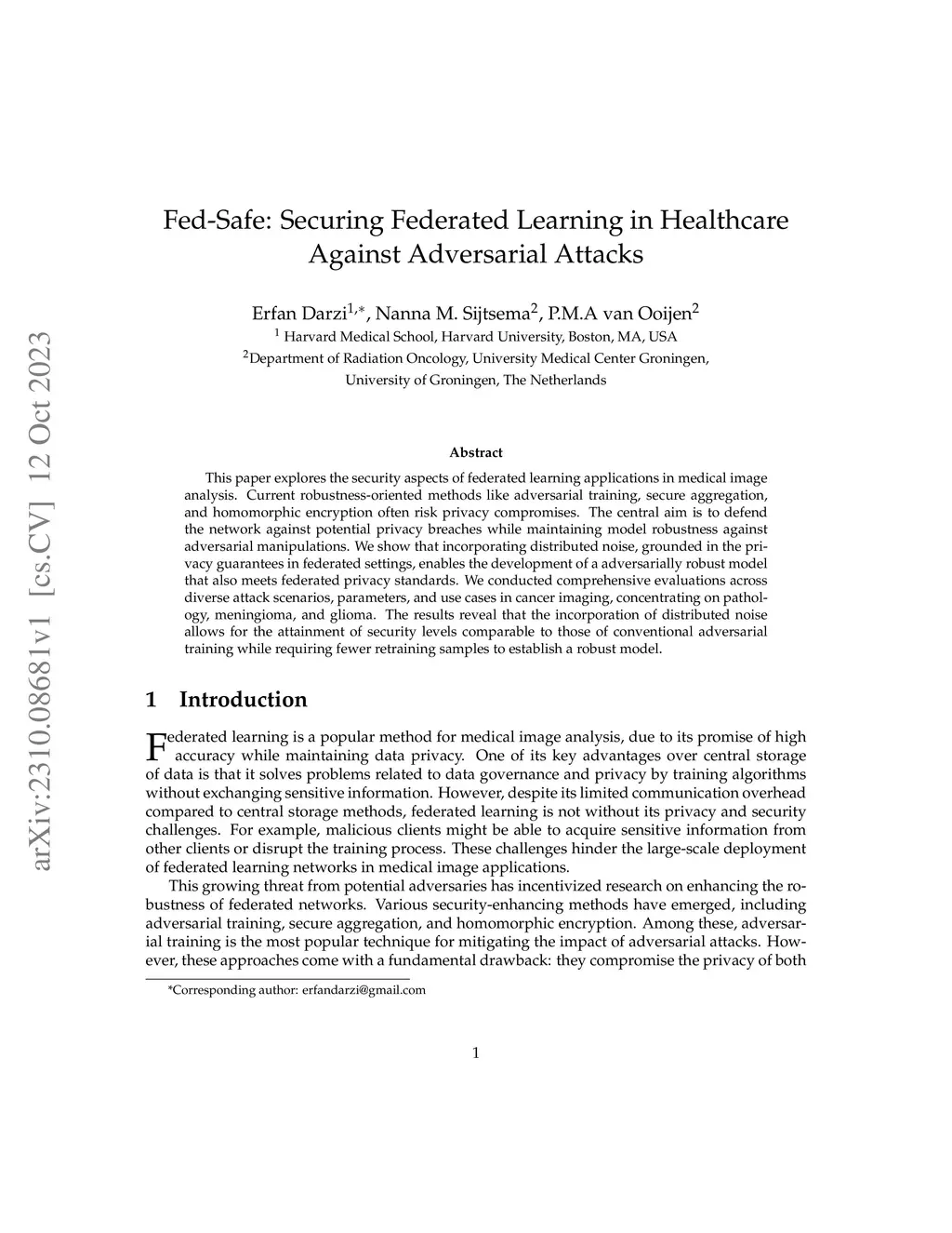 This paper explores the security aspects of federated learning applications in medical image analysis. Current robustness-oriented methods like adversarial training, secure aggregation, and homomorphic encryption often risk privacy compromises. The central aim is to defend the network against potential privacy breaches while maintaining model robustness against adversarial manipulations. We show that incorporating distributed noise, grounded in the privacy guarantees in federated settings, enables the development of a adversarially robust model that also meets federated privacy standards. We conducted comprehensive evaluations across diverse attack scenarios, parameters, and use cases in cancer imaging, concentrating on pathology, meningioma, and glioma. The results reveal that the incorporation of distributed noise allows for the attainment of security levels comparable to those of conventional adversarial training while requiring fewer retraining samples to establish a robust model.