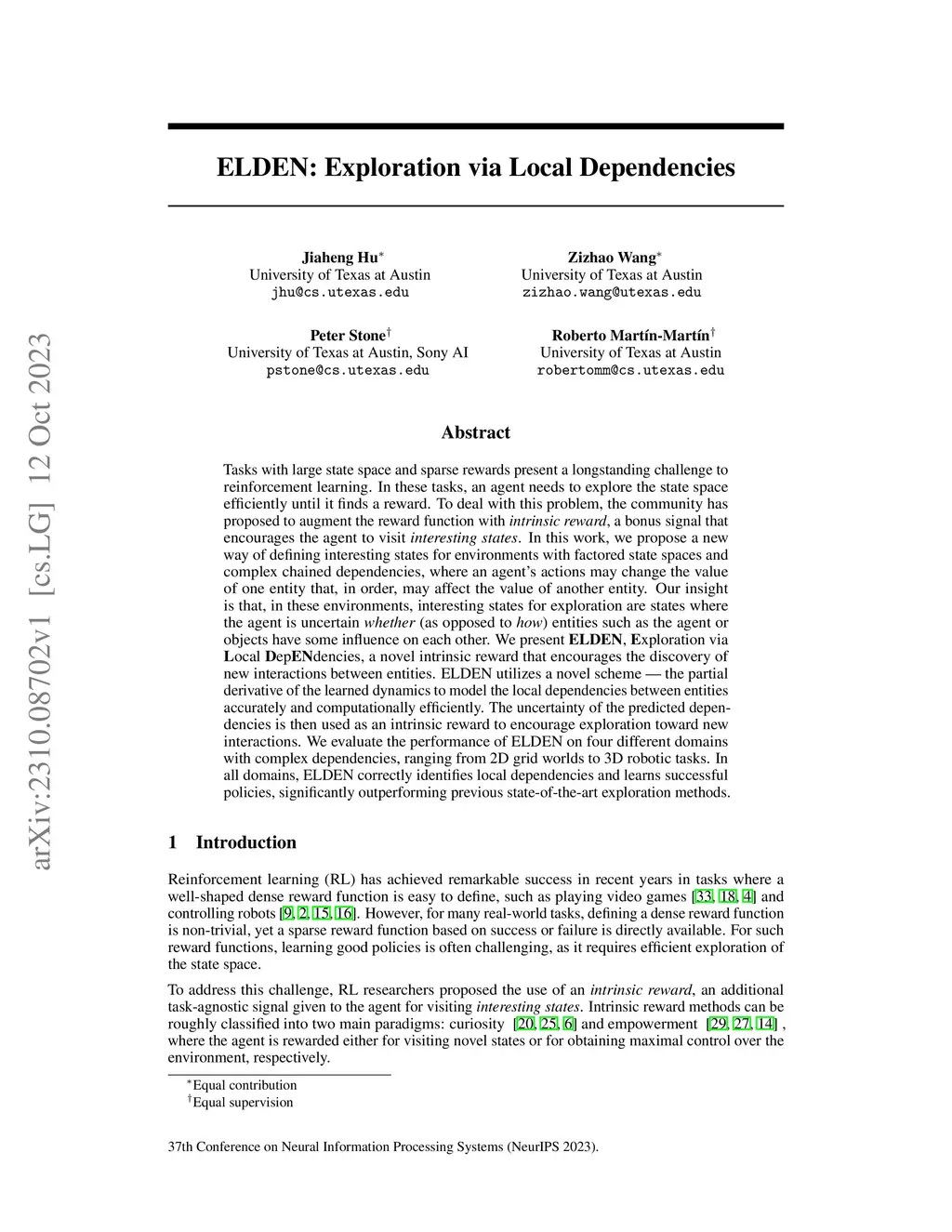 Tasks with large state space and sparse rewards present a longstanding challenge to reinforcement learning. In these tasks, an agent needs to explore the state space efficiently until it finds a reward. To deal with this problem, the community has proposed to augment the reward function with intrinsic reward, a bonus signal that encourages the agent to visit interesting states. In this work, we propose a new way of defining interesting states for environments with factored state spaces and complex chained dependencies, where an agent's actions may change the value of one entity that, in order, may affect the value of another entity. Our insight is that, in these environments, interesting states for exploration are states where the agent is uncertain whether (as opposed to how) entities such as the agent or objects have some influence on each other. We present ELDEN, Exploration via Local DepENdencies, a novel intrinsic reward that encourages the discovery of new interactions between entities. ELDEN utilizes a novel scheme -- the partial derivative of the learned dynamics to model the local dependencies between entities accurately and computationally efficiently. The uncertainty of the predicted dependencies is then used as an intrinsic reward to encourage exploration toward new interactions. We evaluate the performance of ELDEN on four different domains with complex dependencies, ranging from 2D grid worlds to 3D robotic tasks. In all domains, ELDEN correctly identifies local dependencies and learns successful policies, significantly outperforming previous state-of-the-art exploration methods.