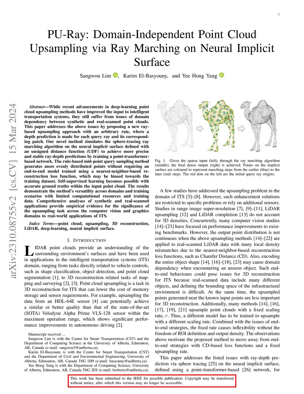 While recent advancements in deep-learning point cloud upsampling methods have improved the input to intelligent transportation systems, they still suffer from issues of domain dependency between synthetic and real-scanned point clouds. This paper addresses the above issues by proposing a new ray-based upsampling approach with an arbitrary rate, where a depth prediction is made for each query ray and its corresponding patch. Our novel method simulates the sphere-tracing ray marching algorithm on the neural implicit surface defined with an unsigned distance function (UDF) to achieve more precise and stable ray-depth predictions by training a point-transformer-based network. The rule-based mid-point query sampling method generates more evenly distributed points without requiring an end-to-end model trained using a nearest-neighbor-based reconstruction loss function, which may be biased towards the training dataset. Self-supervised learning becomes possible with accurate ground truths within the input point cloud. The results demonstrate the method's versatility across domains and training scenarios with limited computational resources and training data. Comprehensive analyses of synthetic and real-scanned applications provide empirical evidence for the significance of the upsampling task across the computer vision and graphics domains to real-world applications of ITS.