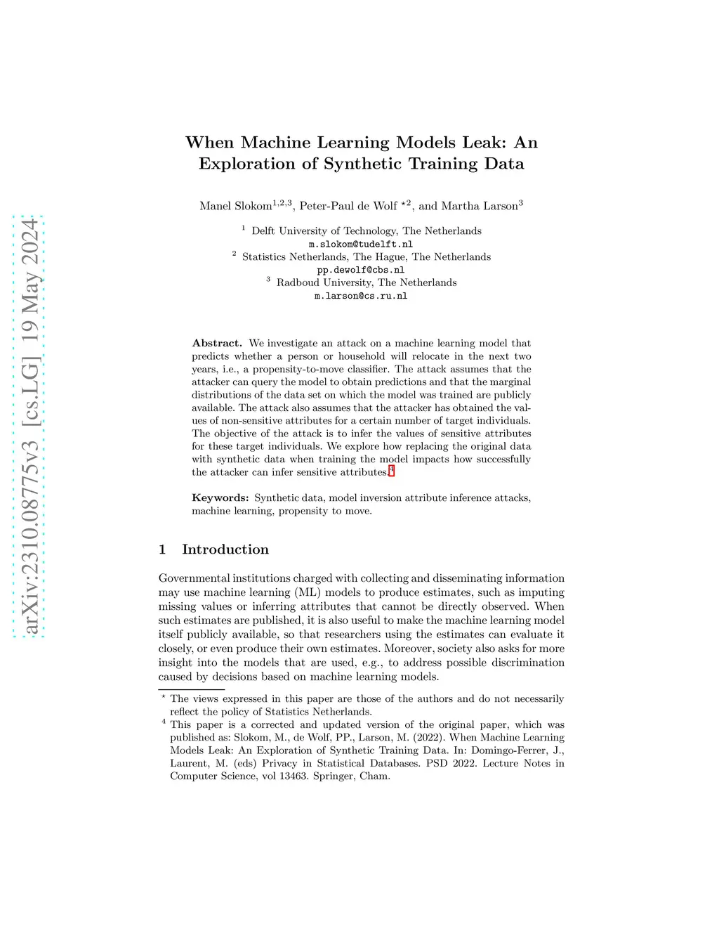 We investigate an attack on a machine learning model that predicts whether a person or household will relocate in the next two years, i.e., a propensity-to-move classifier. The attack assumes that the attacker can query the model to obtain predictions and that the marginal distribution of the data on which the model was trained is publicly available. The attack also assumes that the attacker has obtained the values of non-sensitive attributes for a certain number of target individuals. The objective of the attack is to infer the values of sensitive attributes for these target individuals. We explore how replacing the original data with synthetic data when training the model impacts how successfully the attacker can infer sensitive attributes.