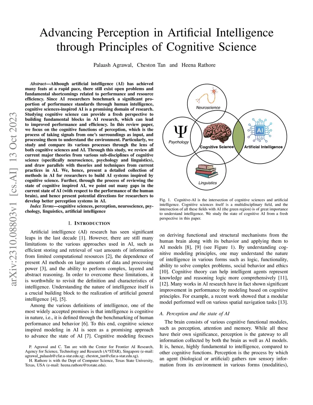 Although artificial intelligence (AI) has achieved many feats at a rapid pace, there still exist open problems and fundamental shortcomings related to performance and resource efficiency. Since AI researchers benchmark a significant proportion of performance standards through human intelligence, cognitive sciences-inspired AI is a promising domain of research. Studying cognitive science can provide a fresh perspective to building fundamental blocks in AI research, which can lead to improved performance and efficiency. In this review paper, we focus on the cognitive functions of perception, which is the process of taking signals from one's surroundings as input, and processing them to understand the environment. Particularly, we study and compare its various processes through the lens of both cognitive sciences and AI. Through this study, we review all current major theories from various sub-disciplines of cognitive science (specifically neuroscience, psychology and linguistics), and draw parallels with theories and techniques from current practices in AI. We, hence, present a detailed collection of methods in AI for researchers to build AI systems inspired by cognitive science. Further, through the process of reviewing the state of cognitive-inspired AI, we point out many gaps in the current state of AI (with respect to the performance of the human brain), and hence present potential directions for researchers to develop better perception systems in AI.