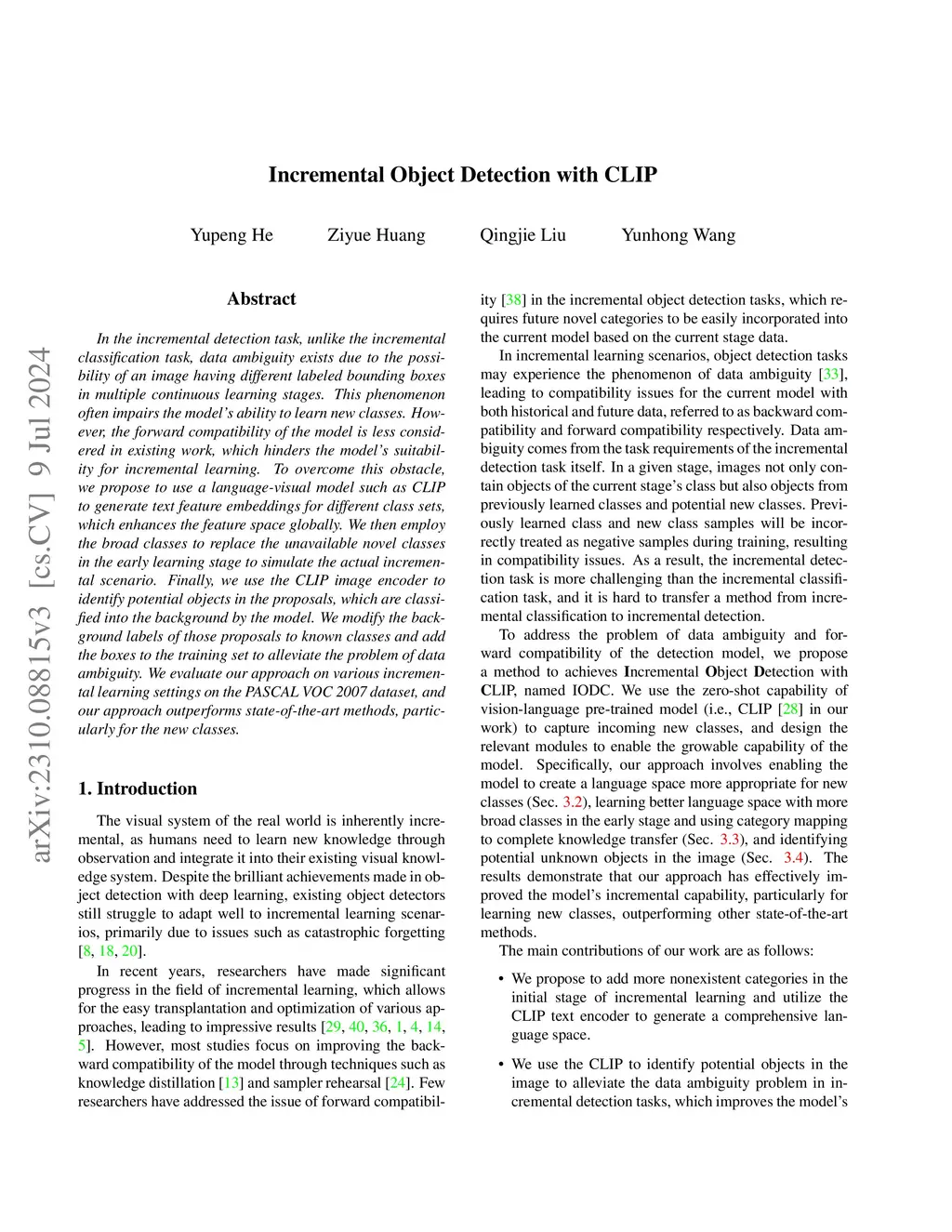 In contrast to the incremental classification task, the incremental detection task is characterized by the presence of data ambiguity, as an image may have differently labeled bounding boxes across multiple continuous learning stages. This phenomenon often impairs the model's ability to effectively learn new classes. However, existing research has paid less attention to the forward compatibility of the model, which limits its suitability for incremental learning. To overcome this obstacle, we propose leveraging a visual-language model such as CLIP to generate text feature embeddings for different class sets, which enhances the feature space globally. We then employ super-classes to replace the unavailable novel classes in the early learning stage to simulate the incremental scenario. Finally, we utilize the CLIP image encoder to accurately identify potential objects. We incorporate the finely recognized detection boxes as pseudo-annotations into the training process, thereby further improving the detection performance. We evaluate our approach on various incremental learning settings using the PASCAL VOC 2007 dataset, and our approach outperforms state-of-the-art methods, particularly for recognizing the new classes.