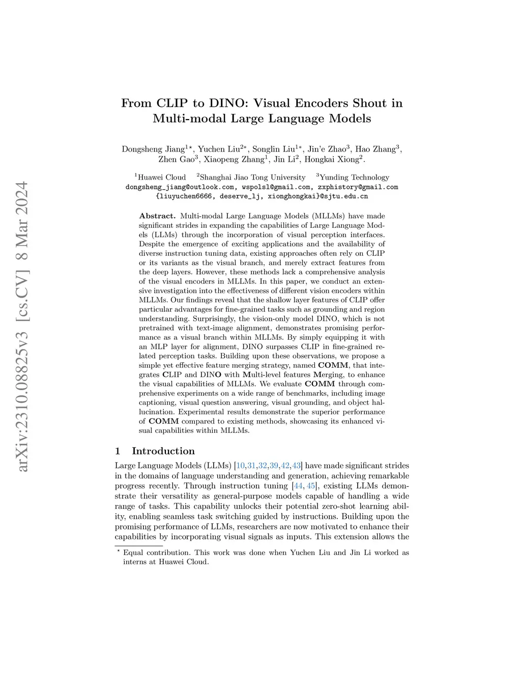 Multi-modal Large Language Models (MLLMs) have made significant strides in expanding the capabilities of Large Language Models (LLMs) through the incorporation of visual perception interfaces. Despite the emergence of exciting applications and the availability of diverse instruction tuning data, existing approaches often rely on CLIP or its variants as the visual branch, and merely extract features from the deep layers. However, these methods lack a comprehensive analysis of the visual encoders in MLLMs. In this paper, we conduct an extensive investigation into the effectiveness of different vision encoders within MLLMs. Our findings reveal that the shallow layer features of CLIP offer particular advantages for fine-grained tasks such as grounding and region understanding. Surprisingly, the vision-only model DINO, which is not pretrained with text-image alignment, demonstrates promising performance as a visual branch within MLLMs. By simply equipping it with an MLP layer for alignment, DINO surpasses CLIP in fine-grained related perception tasks. Building upon these observations, we propose a simple yet effective feature merging strategy, named COMM, that integrates CLIP and DINO with Multi-level features Merging, to enhance the visual capabilities of MLLMs. We evaluate COMM through comprehensive experiments on a wide range of benchmarks, including image captioning, visual question answering, visual grounding, and object hallucination. Experimental results demonstrate the superior performance of COMM compared to existing methods, showcasing its enhanced visual capabilities within MLLMs.
