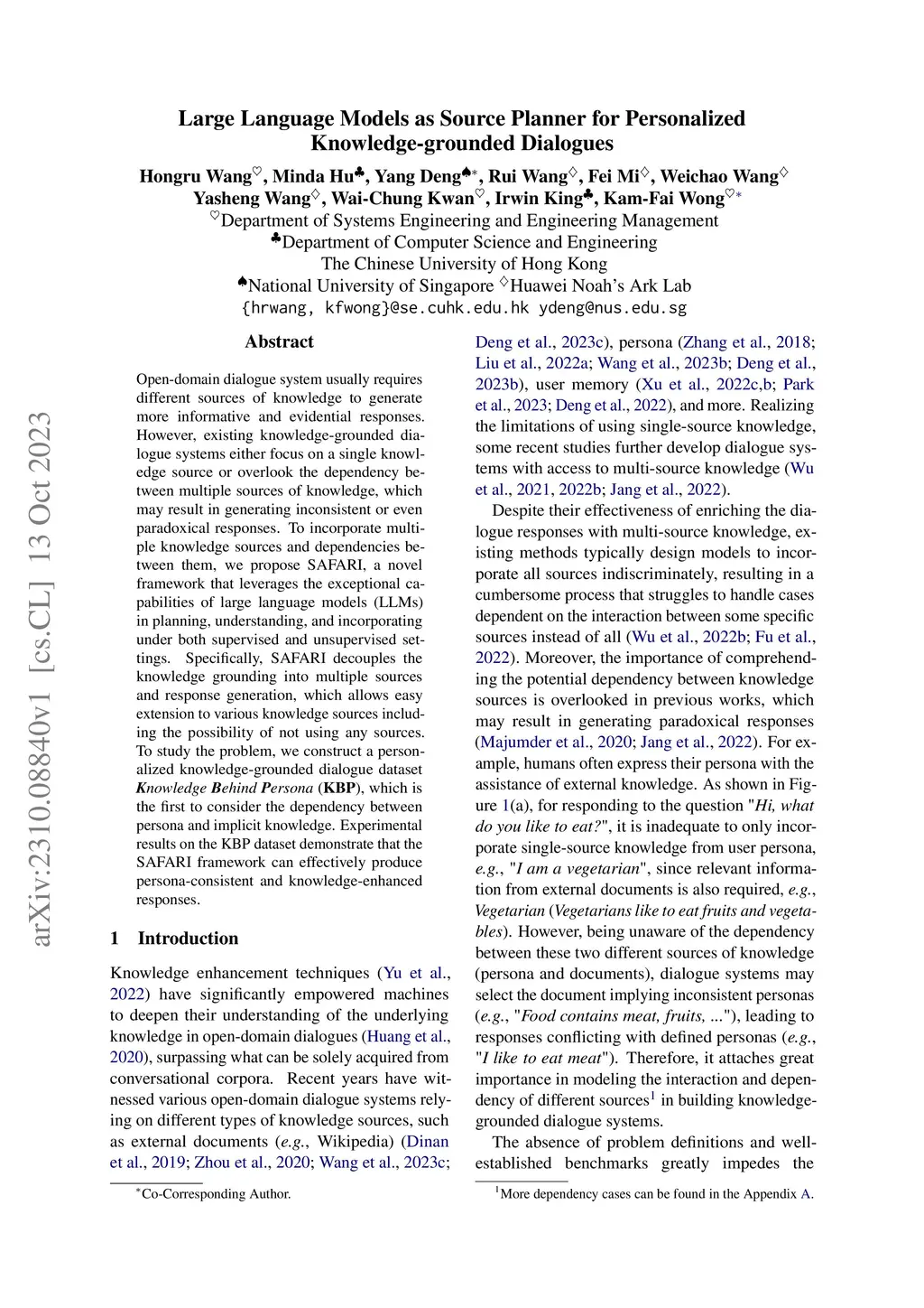 Open-domain dialogue system usually requires different sources of knowledge to generate more informative and evidential responses. However, existing knowledge-grounded dialogue systems either focus on a single knowledge source or overlook the dependency between multiple sources of knowledge, which may result in generating inconsistent or even paradoxical responses. To incorporate multiple knowledge sources and dependencies between them, we propose SAFARI, a novel framework that leverages the exceptional capabilities of large language models (LLMs) in planning, understanding, and incorporating under both supervised and unsupervised settings. Specifically, SAFARI decouples the knowledge grounding into multiple sources and response generation, which allows easy extension to various knowledge sources including the possibility of not using any sources. To study the problem, we construct a personalized knowledge-grounded dialogue dataset \textit{\textbf{K}nowledge \textbf{B}ehind \textbf{P}ersona}~(\textbf{KBP}), which is the first to consider the dependency between persona and implicit knowledge. Experimental results on the KBP dataset demonstrate that the SAFARI framework can effectively produce persona-consistent and knowledge-enhanced responses.