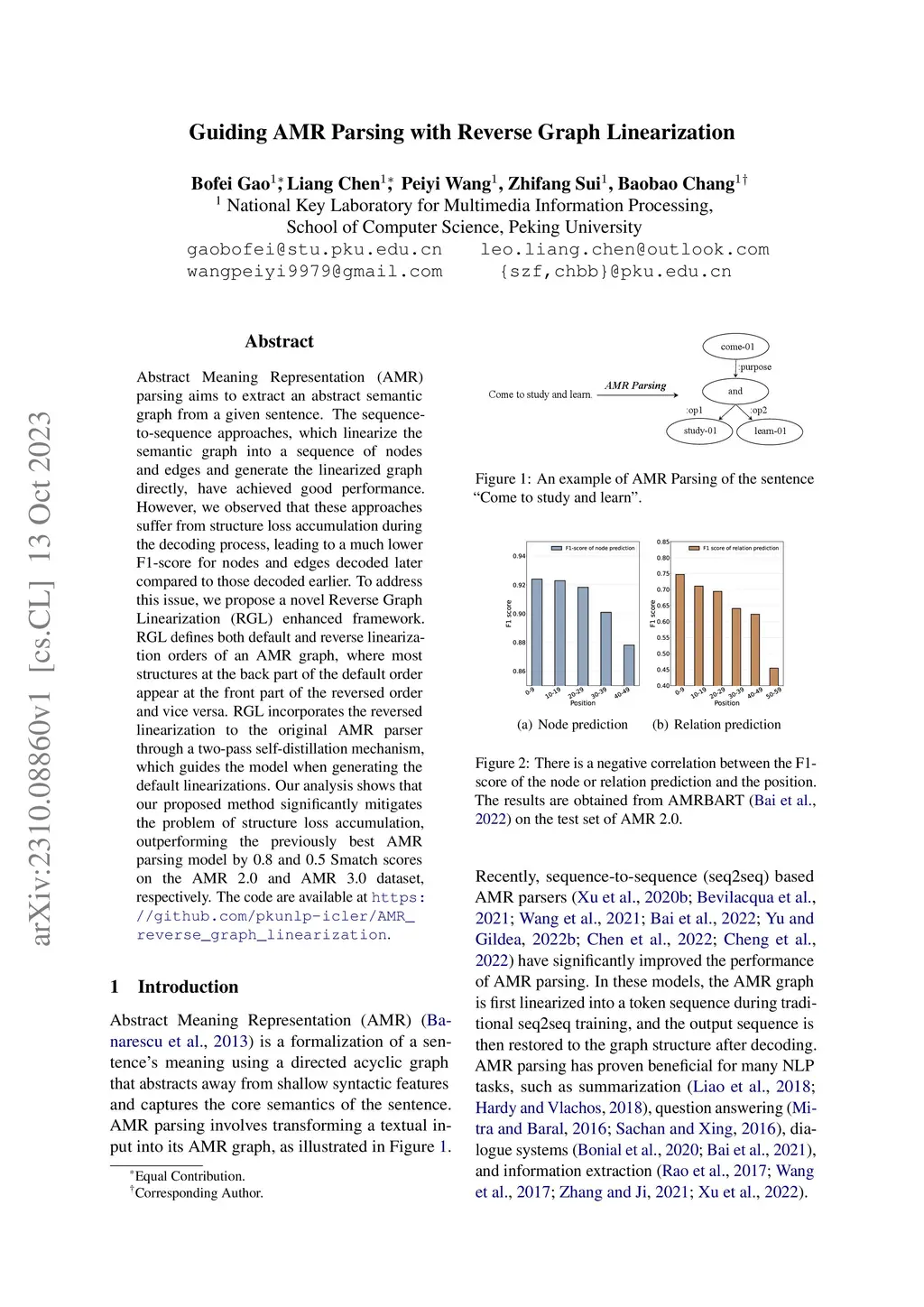 Abstract Meaning Representation (AMR) parsing aims to extract an abstract semantic graph from a given sentence. The sequence-to-sequence approaches, which linearize the semantic graph into a sequence of nodes and edges and generate the linearized graph directly, have achieved good performance. However, we observed that these approaches suffer from structure loss accumulation during the decoding process, leading to a much lower F1-score for nodes and edges decoded later compared to those decoded earlier. To address this issue, we propose a novel Reverse Graph Linearization (RGL) enhanced framework. RGL defines both default and reverse linearization orders of an AMR graph, where most structures at the back part of the default order appear at the front part of the reversed order and vice versa. RGL incorporates the reversed linearization to the original AMR parser through a two-pass self-distillation mechanism, which guides the model when generating the default linearizations. Our analysis shows that our proposed method significantly mitigates the problem of structure loss accumulation, outperforming the previously best AMR parsing model by 0.8 and 0.5 Smatch scores on the AMR 2.0 and AMR 3.0 dataset, respectively. The code are available at https://github.com/pkunlp-icler/AMR_reverse_graph_linearization.