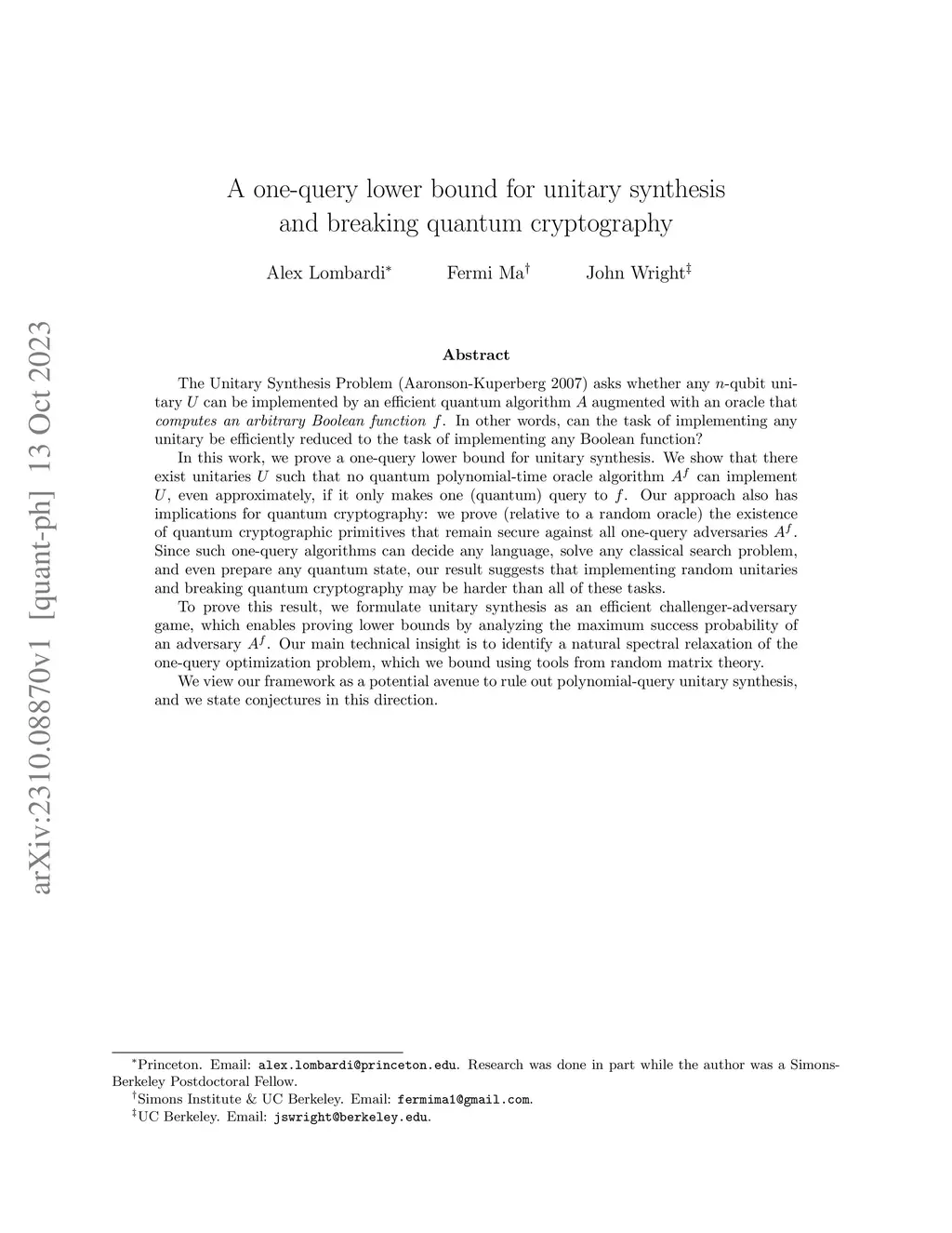 The Unitary Synthesis Problem (Aaronson-Kuperberg 2007) asks whether any -qubit unitary can be implemented by an efficient quantum algorithm augmented with an oracle that computes an arbitrary Boolean function . In other words, can the task of implementing any unitary be efficiently reduced to the task of implementing any Boolean function? In this work, we prove a one-query lower bound for unitary synthesis. We show that there exist unitaries such that no quantum polynomial-time oracle algorithm can implement , even approximately, if it only makes one (quantum) query to . Our approach also has implications for quantum cryptography: we prove (relative to a random oracle) the existence of quantum cryptographic primitives that remain secure against all one-query adversaries . Since such one-query algorithms can decide any language, solve any classical search problem, and even prepare any quantum state, our result suggests that implementing random unitaries and breaking quantum cryptography may be harder than all of these tasks. To prove this result, we formulate unitary synthesis as an efficient challenger-adversary game, which enables proving lower bounds by analyzing the maximum success probability of an adversary . Our main technical insight is to identify a natural spectral relaxation of the one-query optimization problem, which we bound using tools from random matrix theory. We view our framework as a potential avenue to rule out polynomial-query unitary synthesis, and we state conjectures in this direction.