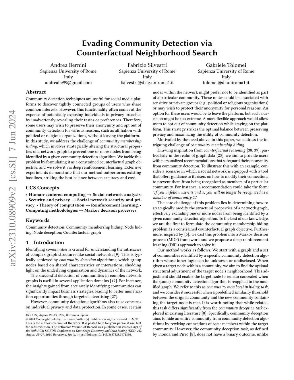 Community detection techniques are useful for social media platforms to discover tightly connected groups of users who share common interests. However, this functionality often comes at the expense of potentially exposing individuals to privacy breaches by inadvertently revealing their tastes or preferences. Therefore, some users may wish to preserve their anonymity and opt out of community detection for various reasons, such as affiliation with political or religious organizations, without leaving the platform. In this study, we address the challenge of community membership hiding, which involves strategically altering the structural properties of a network graph to prevent one or more nodes from being identified by a given community detection algorithm. We tackle this problem by formulating it as a constrained counterfactual graph objective, and we solve it via deep reinforcement learning. Extensive experiments demonstrate that our method outperforms existing baselines, striking the best balance between accuracy and cost.