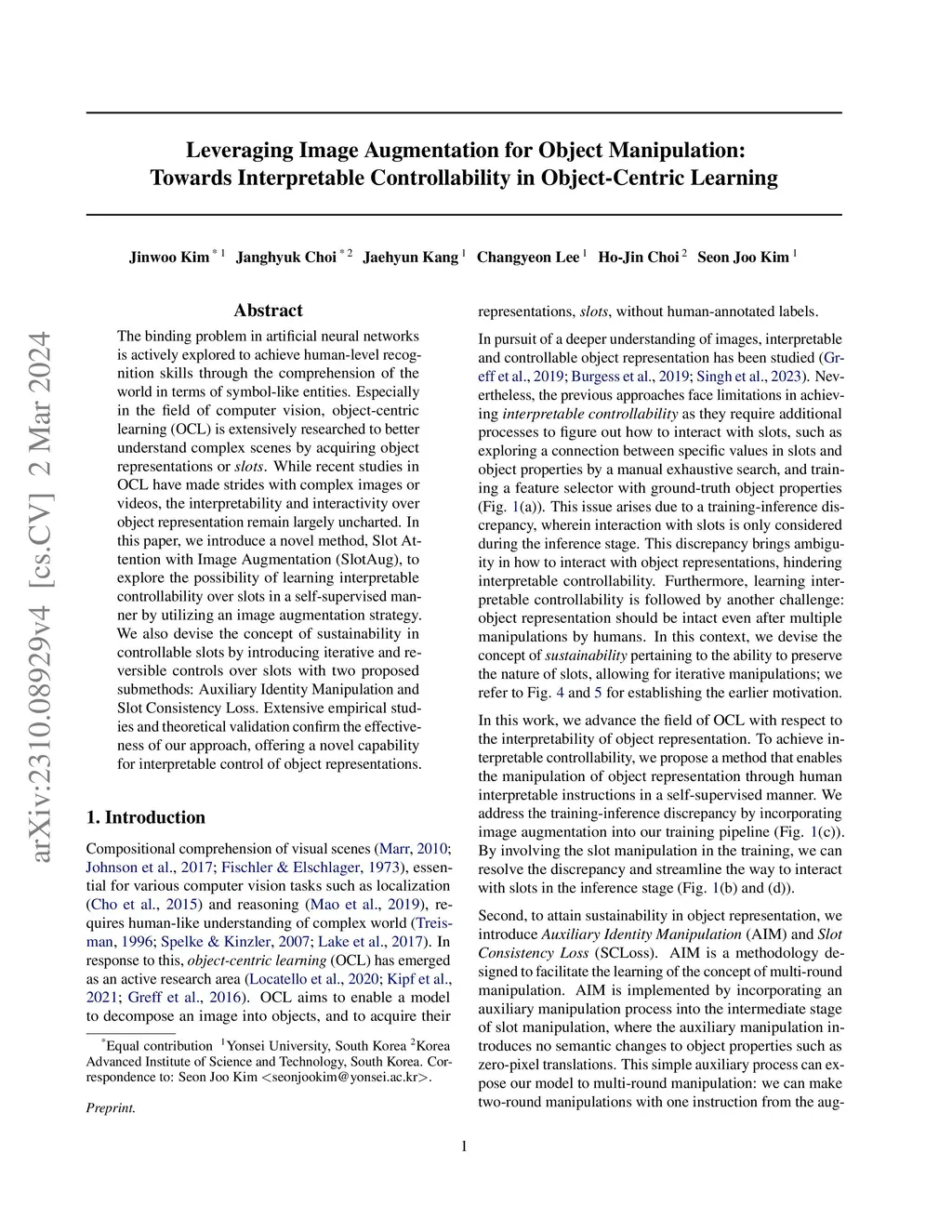 The binding problem in artificial neural networks is actively explored with the goal of achieving human-level recognition skills through the comprehension of the world in terms of symbol-like entities. Especially in the field of computer vision, object-centric learning (OCL) is extensively researched to better understand complex scenes by acquiring object representations or slots. While recent studies in OCL have made strides with complex images or videos, the interpretability and interactivity over object representation remain largely uncharted, still holding promise in the field of OCL. In this paper, we introduce a novel method, Slot Attention with Image Augmentation (SlotAug), to explore the possibility of learning interpretable controllability over slots in a self-supervised manner by utilizing an image augmentation strategy. We also devise the concept of sustainability in controllable slots by introducing iterative and reversible controls over slots with two proposed submethods: Auxiliary Identity Manipulation and Slot Consistency Loss. Extensive empirical studies and theoretical validation confirm the effectiveness of our approach, offering a novel capability for interpretable and sustainable control of object representations.