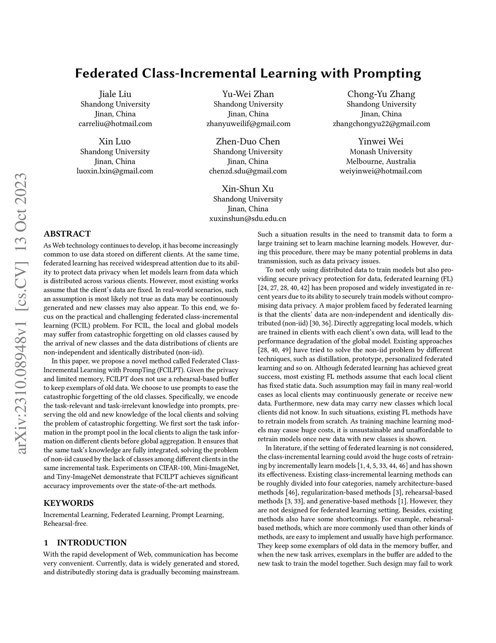 As Web technology continues to develop, it has become increasingly common to use data stored on different clients. At the same time, federated learning has received widespread attention due to its ability to protect data privacy when let models learn from data which is distributed across various clients. However, most existing works assume that the client's data are fixed. In real-world scenarios, such an assumption is most likely not true as data may be continuously generated and new classes may also appear. To this end, we focus on the practical and challenging federated class-incremental learning (FCIL) problem. For FCIL, the local and global models may suffer from catastrophic forgetting on old classes caused by the arrival of new classes and the data distributions of clients are non-independent and identically distributed (non-iid).In this paper, we propose a novel method called Federated Class-Incremental Learning with PrompTing (FCILPT). Given the privacy and limited memory, FCILPT does not use a rehearsal-based buffer to keep exemplars of old data. We choose to use prompts to ease the catastrophic forgetting of the old classes. Specifically, we encode the task-relevant and task-irrelevant knowledge into prompts, preserving the old and new knowledge of the local clients and solving the problem of catastrophic forgetting. We first sort the task information in the prompt pool in the local clients to align the task information on different clients before global aggregation. It ensures that the same task's knowledge are fully integrated, solving the problem of non-iid caused by the lack of classes among different clients in the same incremental task. Experiments on CIFAR-100, Mini-ImageNet, and Tiny-ImageNet demonstrate that FCILPT achieves significant accuracy improvements over the state-of-the-art methods.