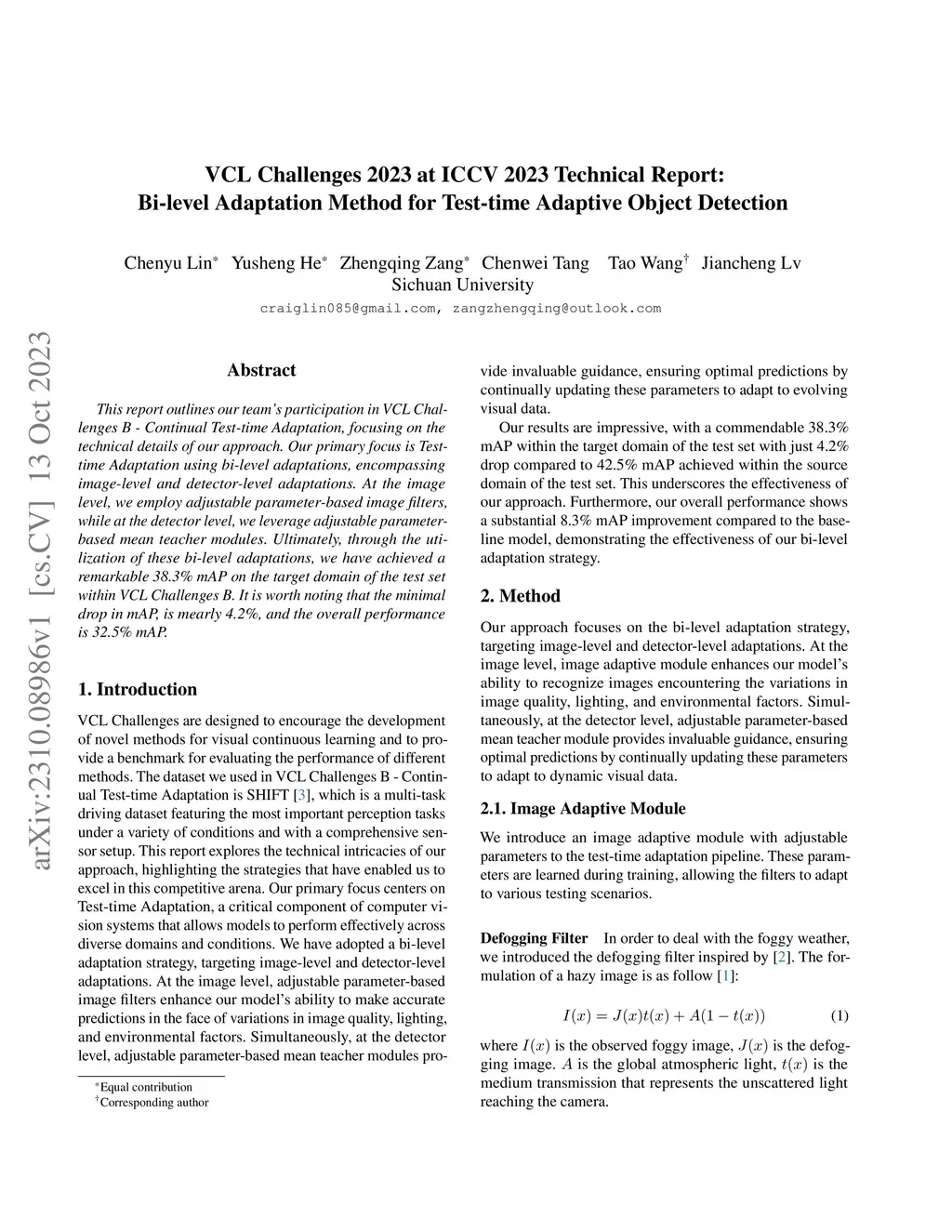 This report outlines our team's participation in VCL Challenges B Continual Test_time Adaptation, focusing on the technical details of our approach. Our primary focus is Testtime Adaptation using bi_level adaptations, encompassing image_level and detector_level adaptations. At the image level, we employ adjustable parameterbased image filters, while at the detector level, we leverage adjustable parameterbased mean teacher modules. Ultimately, through the utilization of these bi_level adaptations, we have achieved a remarkable 38.3% mAP on the target domain of the test set within VCL Challenges B. It is worth noting that the minimal drop in mAP, is mearly 4.2%, and the overall performance is 32.5% mAP.