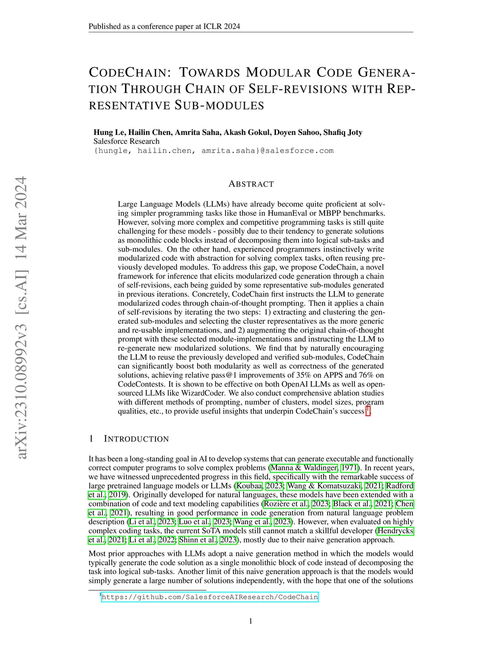 Large Language Models (LLMs) have already become quite proficient at solving simpler programming tasks like those in HumanEval or MBPP benchmarks. However, solving more complex and competitive programming tasks is still quite challenging for these models - possibly due to their tendency to generate solutions as monolithic code blocks instead of decomposing them into logical sub-tasks and sub-modules. On the other hand, experienced programmers instinctively write modularized code with abstraction for solving complex tasks, often reusing previously developed modules. To address this gap, we propose CodeChain, a novel framework for inference that elicits modularized code generation through a chain of self-revisions, each being guided by some representative sub-modules generated in previous iterations. Concretely, CodeChain first instructs the LLM to generate modularized codes through chain-of-thought prompting. Then it applies a chain of self-revisions by iterating the two steps: 1) extracting and clustering the generated sub-modules and selecting the cluster representatives as the more generic and re-usable implementations, and 2) augmenting the original chain-of-thought prompt with these selected module-implementations and instructing the LLM to re-generate new modularized solutions. We find that by naturally encouraging the LLM to reuse the previously developed and verified sub-modules, CodeChain can significantly boost both modularity as well as correctness of the generated solutions, achieving relative pass@1 improvements of 35% on APPS and 76% on CodeContests. It is shown to be effective on both OpenAI LLMs as well as open-sourced LLMs like WizardCoder. We also conduct comprehensive ablation studies with different methods of prompting, number of clusters, model sizes, program qualities, etc., to provide useful insights that underpin CodeChain's success.