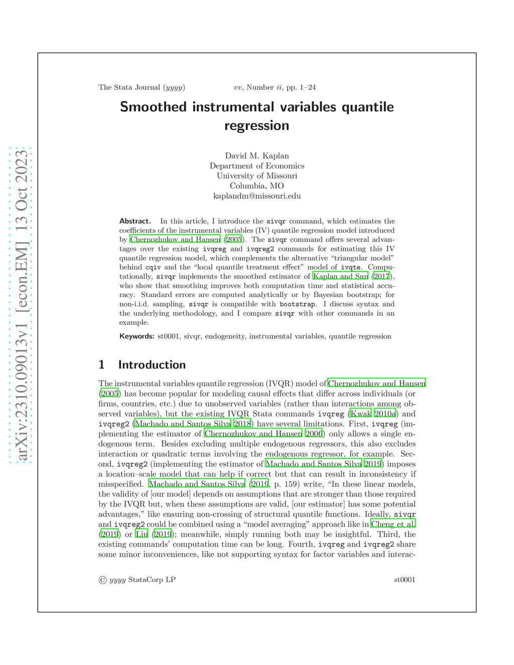 In this article, I introduce the sivqr command, which estimates the coefficients of the instrumental variables (IV) quantile regression model introduced by Chernozhukov and Hansen (2005). The sivqr command offers several advantages over the existing ivqreg and ivqreg2 commands for estimating this IV quantile regression model, which complements the alternative "triangular model" behind cqiv and the "local quantile treatment effect" model of ivqte. Computationally, sivqr implements the smoothed estimator of Kaplan and Sun (2017), who show that smoothing improves both computation time and statistical accuracy. Standard errors are computed analytically or by Bayesian bootstrap; for non-iid sampling, sivqr is compatible with bootstrap. I discuss syntax and the underlying methodology, and I compare sivqr with other commands in an example.