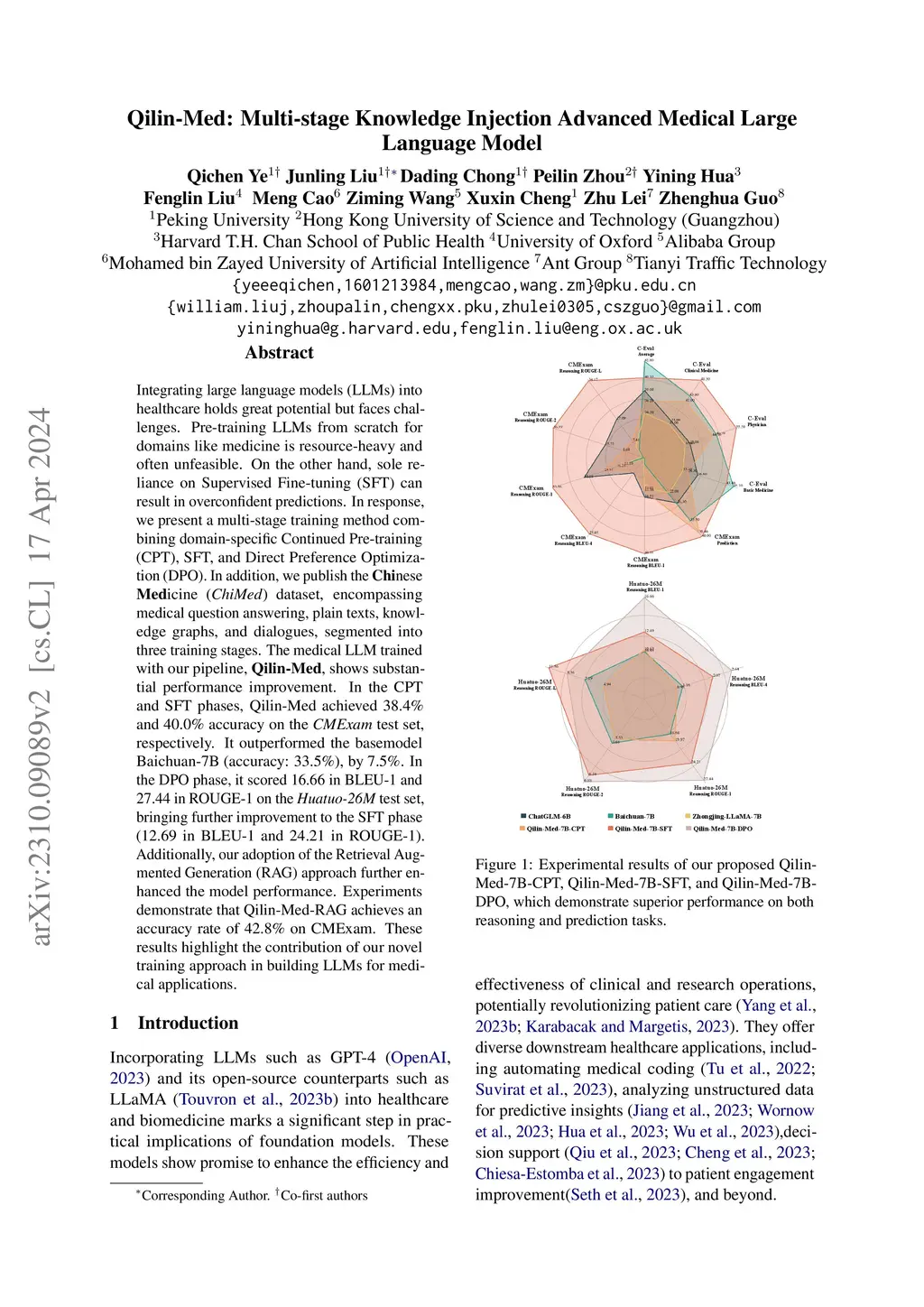 Integrating large language models (LLMs) into healthcare holds great potential but faces challenges. Pre-training LLMs from scratch for domains like medicine is resource-heavy and often unfeasible. On the other hand, sole reliance on Supervised Fine-tuning (SFT) can result in overconfident predictions and may not tap into domain-specific insights. In response, we present a multi-stage training method combining Domain-specific Continued Pre-training (DCPT), SFT, and Direct Preference Optimization (DPO). In addition, we publish a 3Gb Chinese Medicine (ChiMed) dataset, encompassing medical question answering, plain texts, knowledge graphs, and dialogues, segmented into three training stages. The medical LLM trained with our pipeline, Qilin-Med, shows substantial performance improvement. In the CPT and SFT phases, Qilin-Med achieved 38.4% and 40.0% accuracy on the CMExam test set, respectively. It outperformed the basemodel Baichuan-7B (accuracy: 33.5%), by 7.5%. In the DPO phase, it scored 16.66 in BLEU-1 and 27.44 in ROUGE-1 on the Huatuo-26M test set, bringing further improvement to the SFT phase (12.69 in BLEU-1 and 24.21 in ROUGE-1). Additionally, we have further enhanced the model's performance through the Retrieval Augmented Generation (RAG) approach. Experiments demonstrate that Qilin-Med-RAG achieves an accuracy rate of 42.8% on CMExam. These results highlight the contribution of our novel training approach in building LLMs for medical applications.