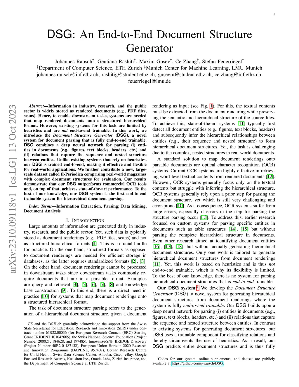 Information in industry, research, and the public sector is widely stored as rendered documents (e.g., PDF files, scans). Hence, to enable downstream tasks, systems are needed that map rendered documents onto a structured hierarchical format. However, existing systems for this task are limited by heuristics and are not end-to-end trainable. In this work, we introduce the Document Structure Generator (DSG), a novel system for document parsing that is fully end-to-end trainable. DSG combines a deep neural network for parsing (i) entities in documents (e.g., figures, text blocks, headers, etc.) and (ii) relations that capture the sequence and nested structure between entities. Unlike existing systems that rely on heuristics, our DSG is trained end-to-end, making it effective and flexible for real-world applications. We further contribute a new, large-scale dataset called E-Periodica comprising real-world magazines with complex document structures for evaluation. Our results demonstrate that our DSG outperforms commercial OCR tools and, on top of that, achieves state-of-the-art performance. To the best of our knowledge, our DSG system is the first end-to-end trainable system for hierarchical document parsing.