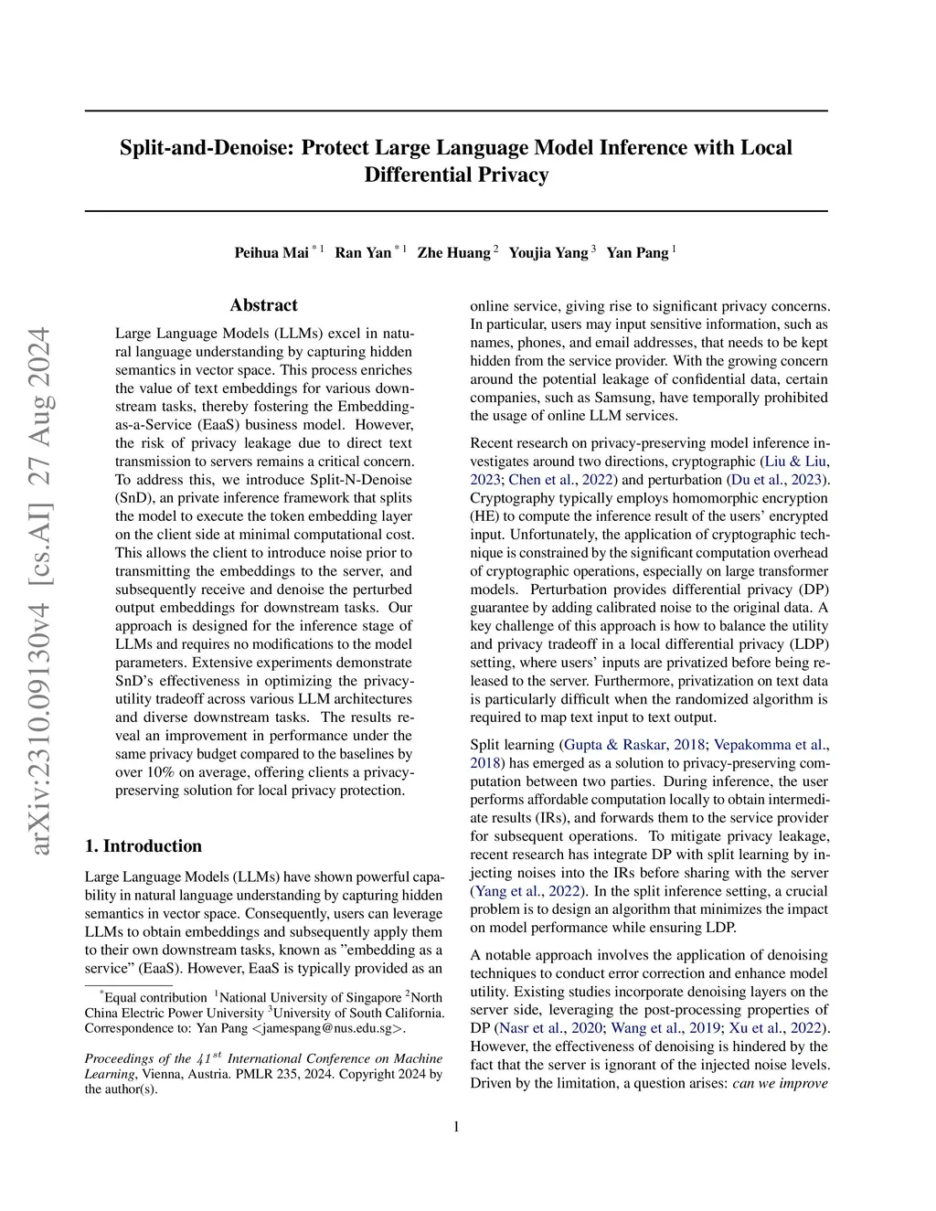 Large Language Models (LLMs) excel in natural language understanding by capturing hidden semantics in vector space. This process enriches the value of text embeddings for various downstream tasks, thereby fostering the Embedding-as-a-Service (EaaS) business model. However, the risk of privacy leakage due to direct text transmission to servers remains a critical concern. To address this, we introduce Split-N-Denoise (SnD), an private inference framework that splits the model to execute the token embedding layer on the client side at minimal computational cost. This allows the client to introduce noise prior to transmitting the embeddings to the server, and subsequently receive and denoise the perturbed output embeddings for downstream tasks. Our approach is designed for the inference stage of LLMs and requires no modifications to the model parameters. Extensive experiments demonstrate SnD's effectiveness in optimizing the privacy-utility tradeoff across various LLM architectures and diverse downstream tasks. The results reveal an improvement in performance under the same privacy budget compared to the baselines by over 10\% on average, offering clients a privacy-preserving solution for local privacy protection.