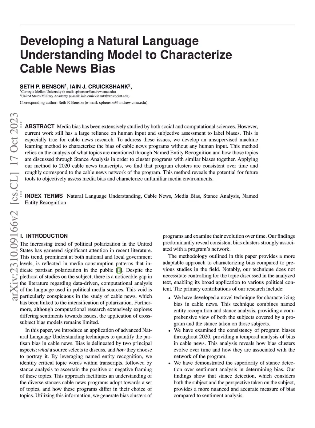 Media bias has been extensively studied by both social and computational sciences. However, current work still has a large reliance on human input and subjective assessment to label biases. This is especially true for cable news research. To address these issues, we develop an unsupervised machine learning method to characterize the bias of cable news programs without any human input. This method relies on the analysis of what topics are mentioned through Named Entity Recognition and how those topics are discussed through Stance Analysis in order to cluster programs with similar biases together. Applying our method to 2020 cable news transcripts, we find that program clusters are consistent over time and roughly correspond to the cable news network of the program. This method reveals the potential for future tools to objectively assess media bias and characterize unfamiliar media environments.