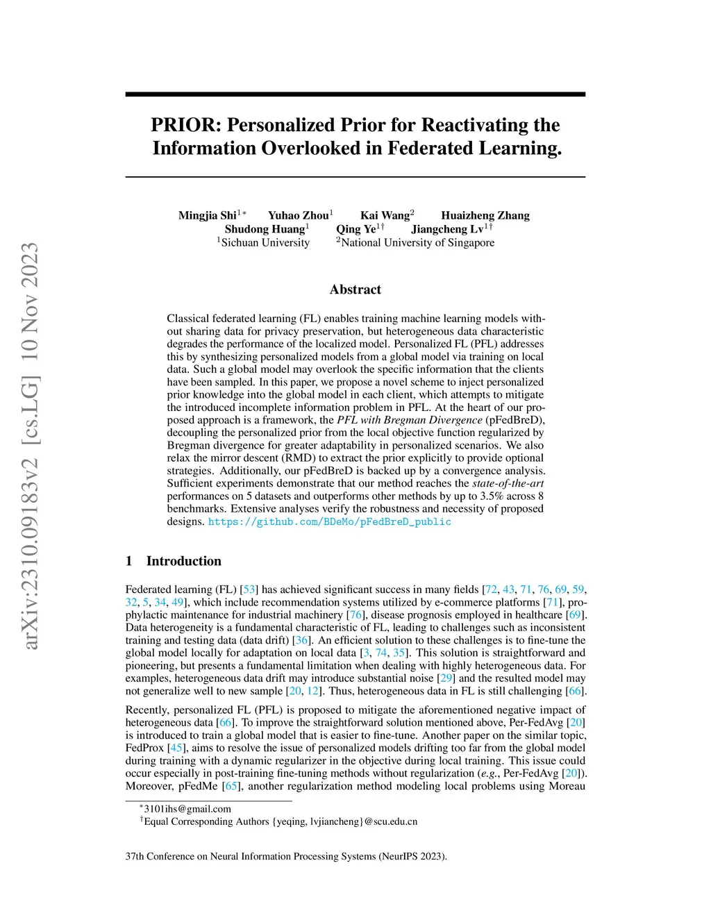 Classical federated learning (FL) enables training machine learning models without sharing data for privacy preservation, but heterogeneous data characteristic degrades the performance of the localized model. Personalized FL (PFL) addresses this by synthesizing personalized models from a global model via training on local data. Such a global model may overlook the specific information that the clients have been sampled. In this paper, we propose a novel scheme to inject personalized prior knowledge into the global model in each client, which attempts to mitigate the introduced incomplete information problem in PFL. At the heart of our proposed approach is a framework, the PFL with Bregman Divergence (pFedBreD), decoupling the personalized prior from the local objective function regularized by Bregman divergence for greater adaptability in personalized scenarios. We also relax the mirror descent (RMD) to extract the prior explicitly to provide optional strategies. Additionally, our pFedBreD is backed up by a convergence analysis. Sufficient experiments demonstrate that our method reaches the state-of-the-art performances on 5 datasets and outperforms other methods by up to 3.5% across 8 benchmarks. Extensive analyses verify the robustness and necessity of proposed designs.
