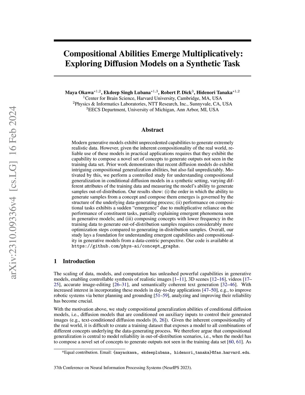 Compositional Abilities Emerge Multiplicatively: Exploring Diffusion Models on a Synthetic Task