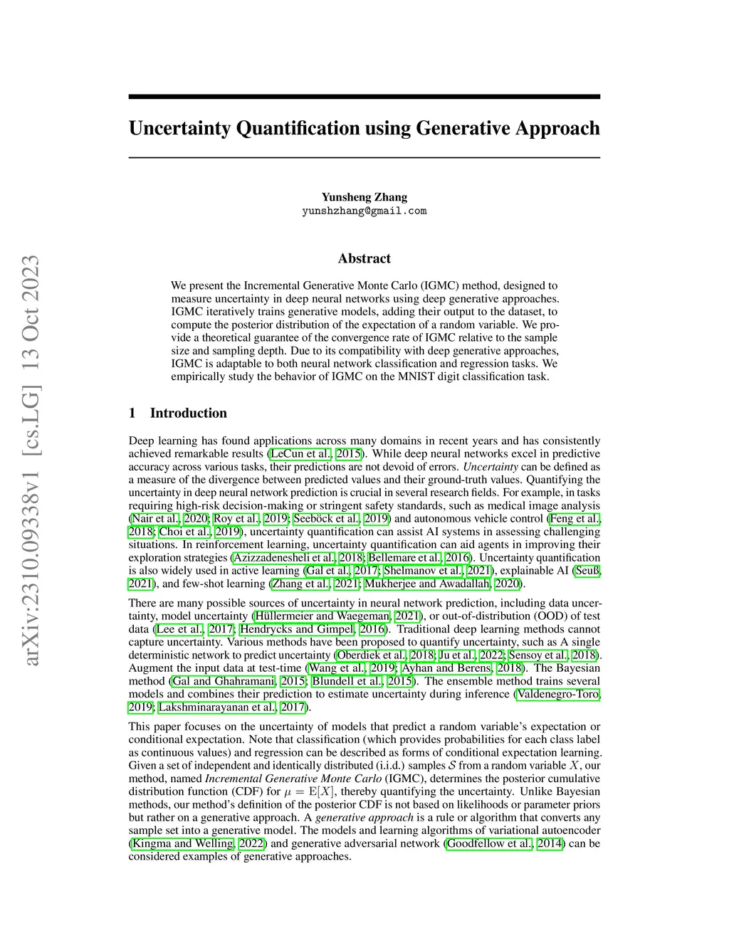 We present the Incremental Generative Monte Carlo (IGMC) method, designed to measure uncertainty in deep neural networks using deep generative approaches. IGMC iteratively trains generative models, adding their output to the dataset, to compute the posterior distribution of the expectation of a random variable. We provide a theoretical guarantee of the convergence rate of IGMC relative to the sample size and sampling depth. Due to its compatibility with deep generative approaches, IGMC is adaptable to both neural network classification and regression tasks. We empirically study the behavior of IGMC on the MNIST digit classification task.