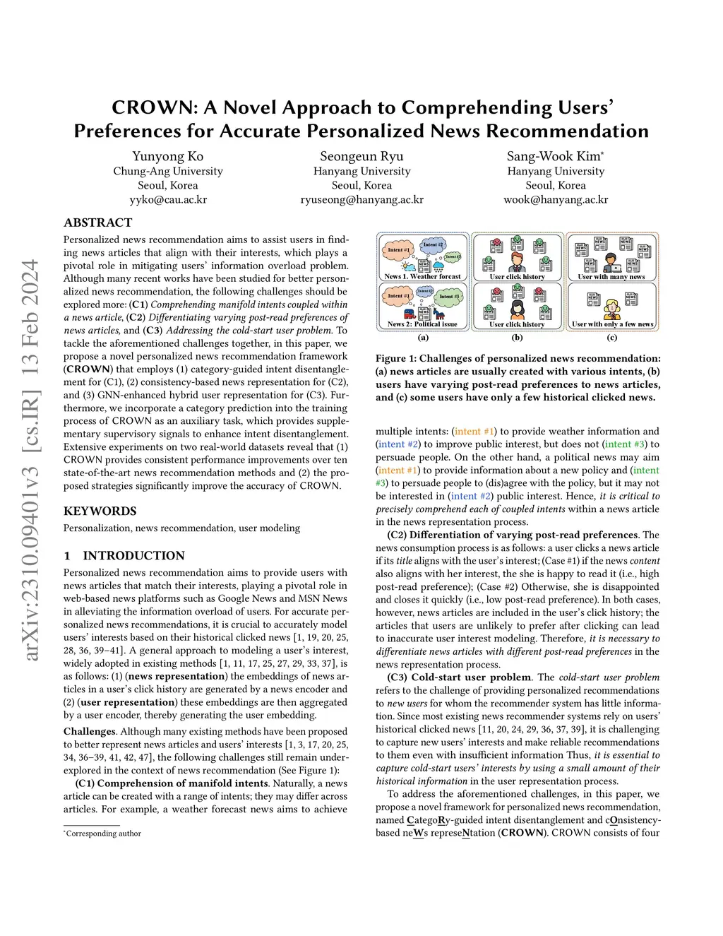 CROWN: A Novel Approach to Comprehending Users' Preferences for Accurate Personalized News Recommendation